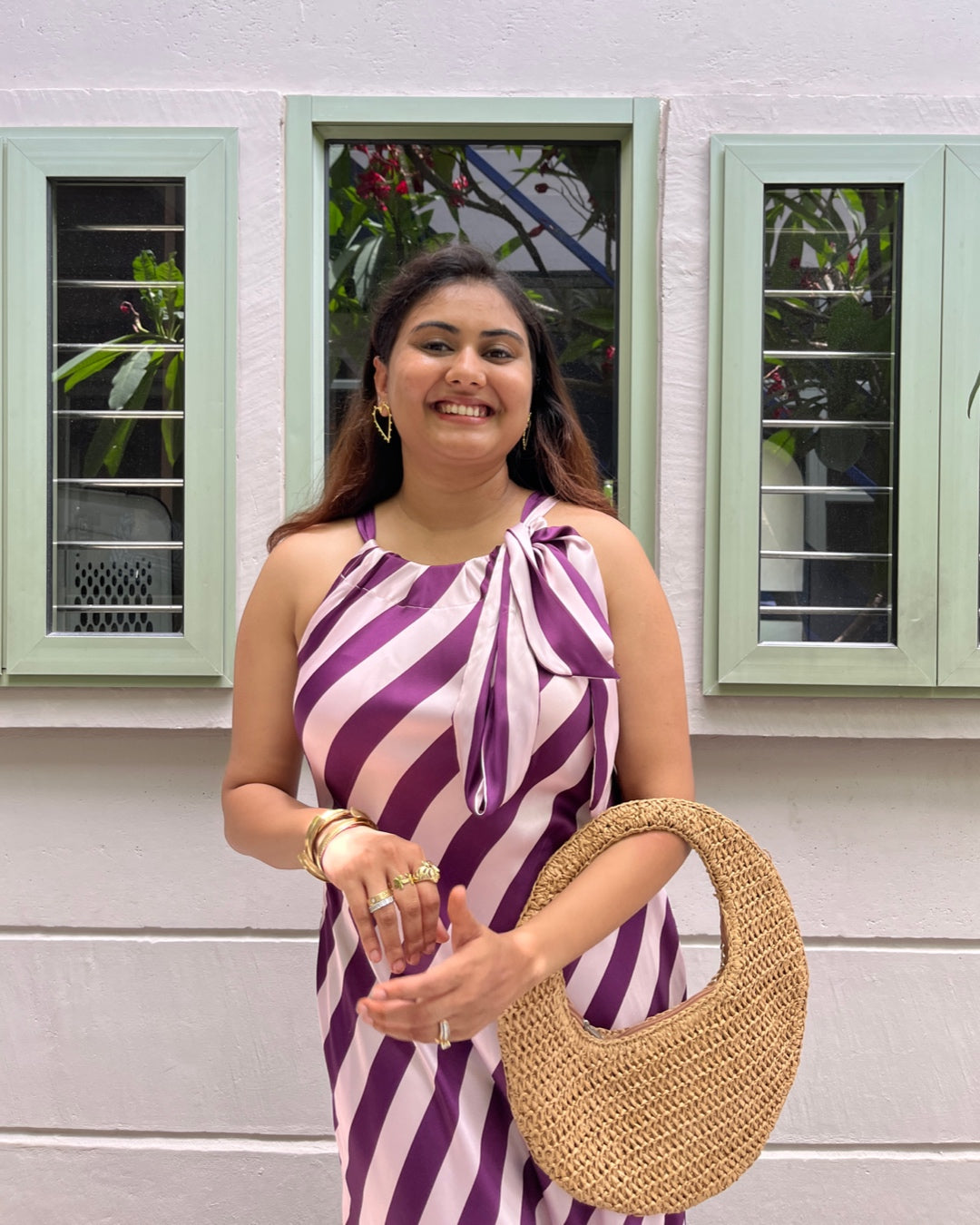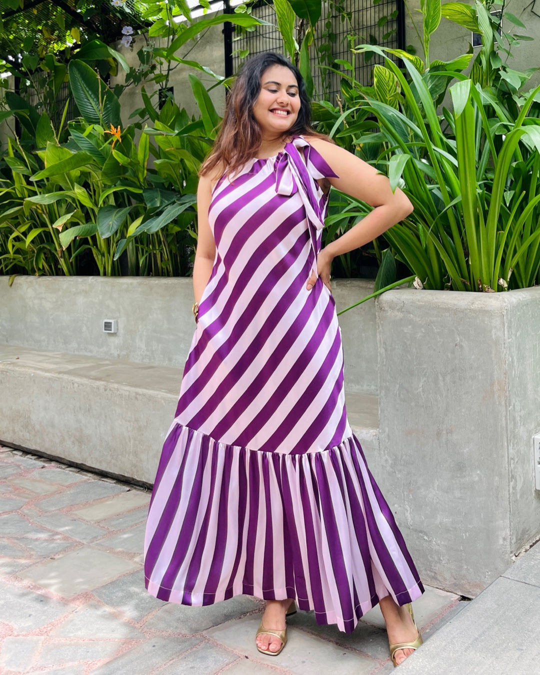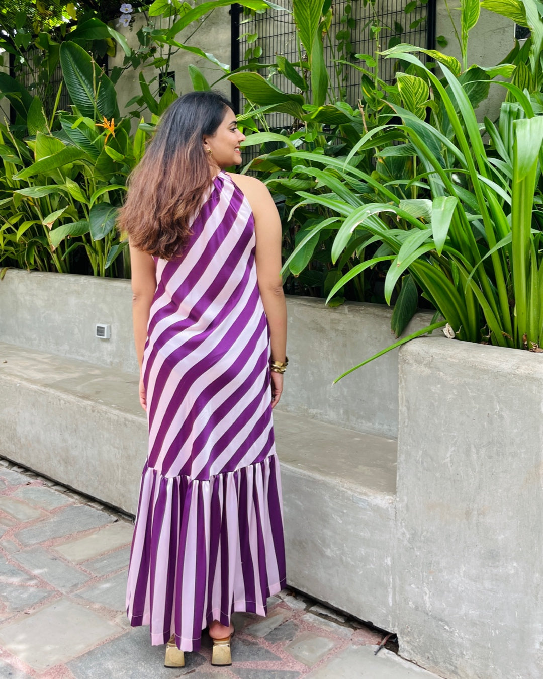 Elevate your style with this deep purple stripped halter neck maxi dress. Crafted from soft, flowing fabric, it features a flattering halter neckline with a charming tie-up bow detail and convenient pockets for everyday ease. Perfect for warm days and breezy evenings, this dress combines comfort and timeless elegance.