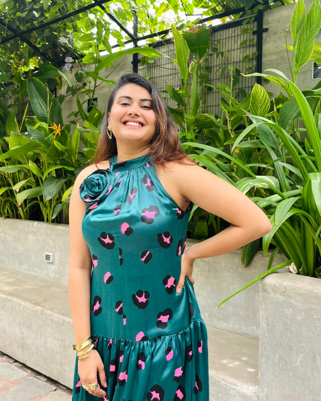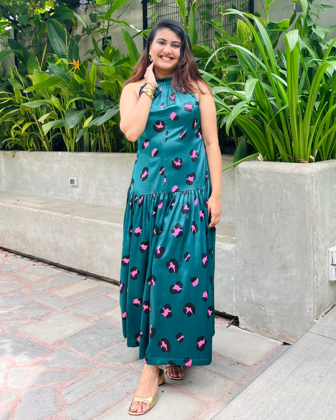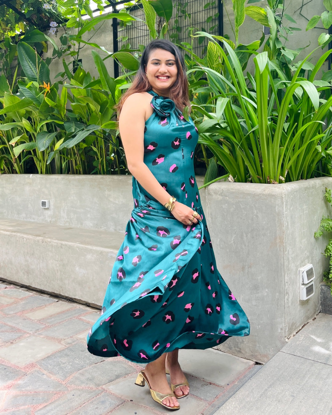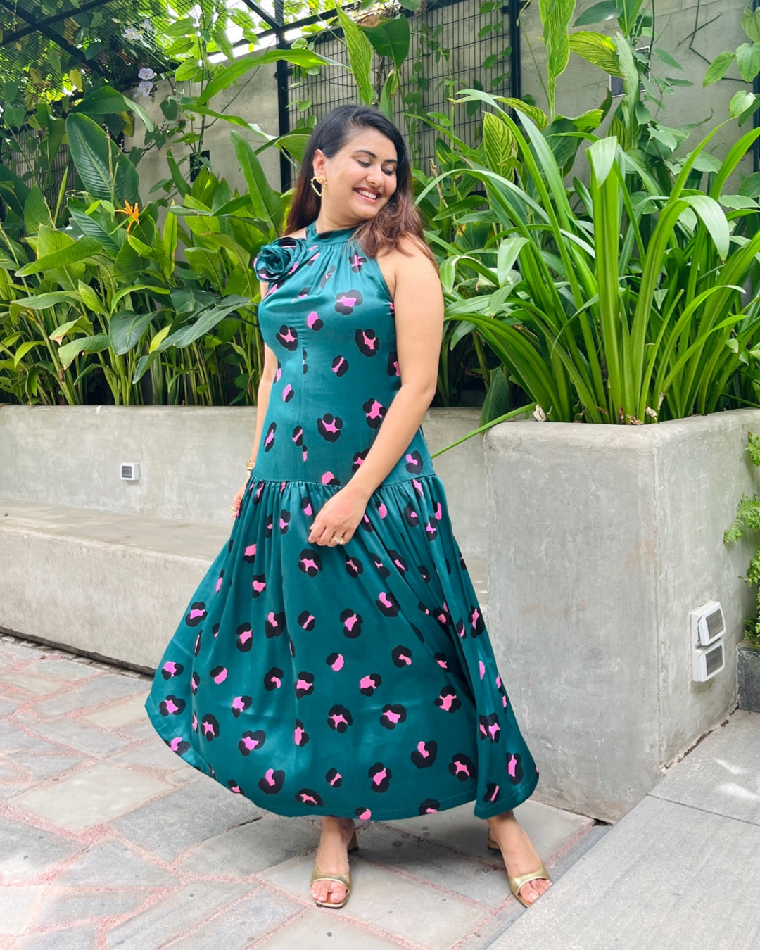 Own the night in this striking green leapord print halter neck maxi dress, designed for bold elegance with a touch of romance. The halter neckline is beautifully framed with floral detailing, adding a soft, feminine contrast to the wild print. With its flowing silhouette and practical pockets, this dress blends statement style with effortless comfort—perfect for evening outings or special occasions.