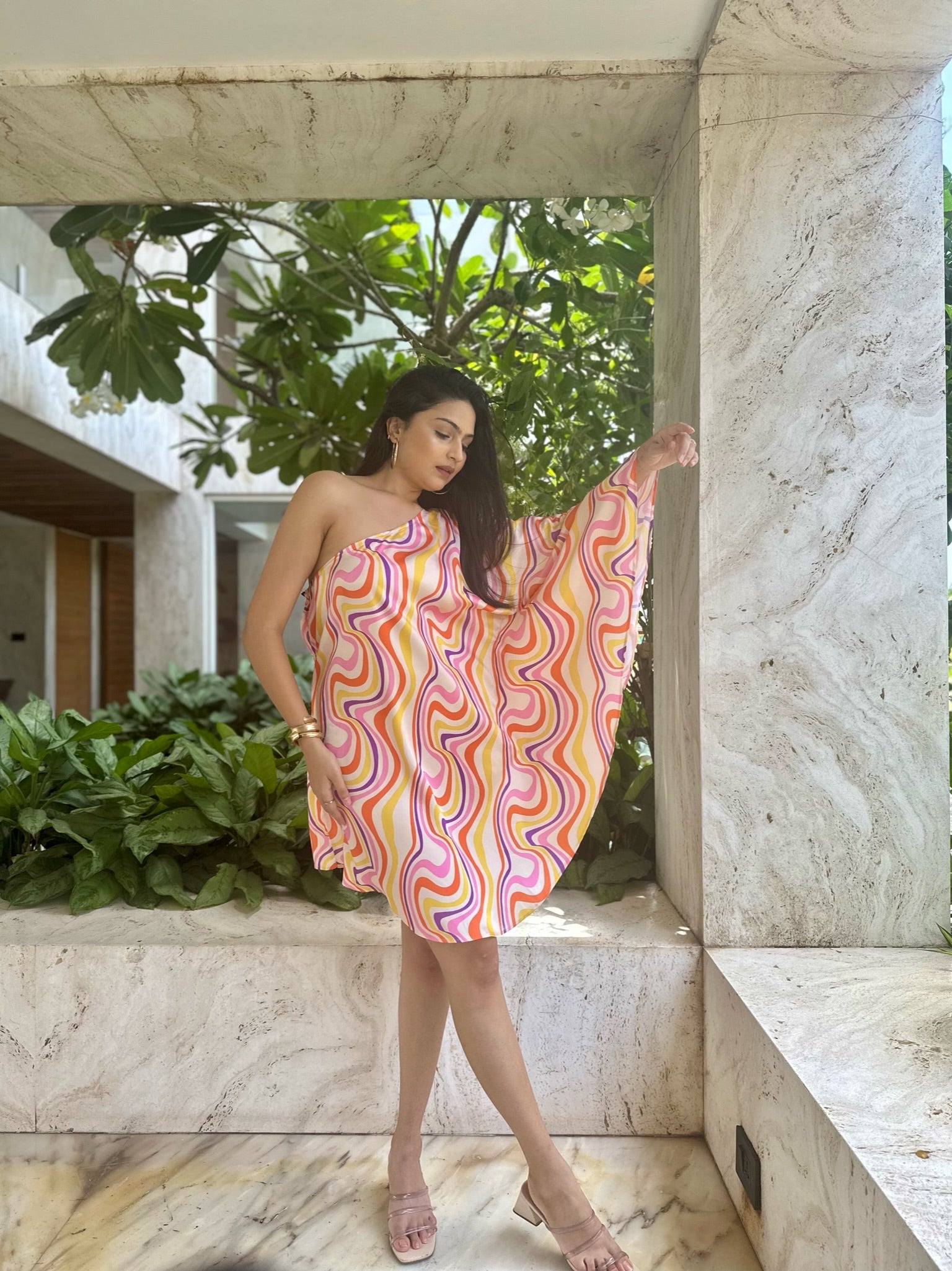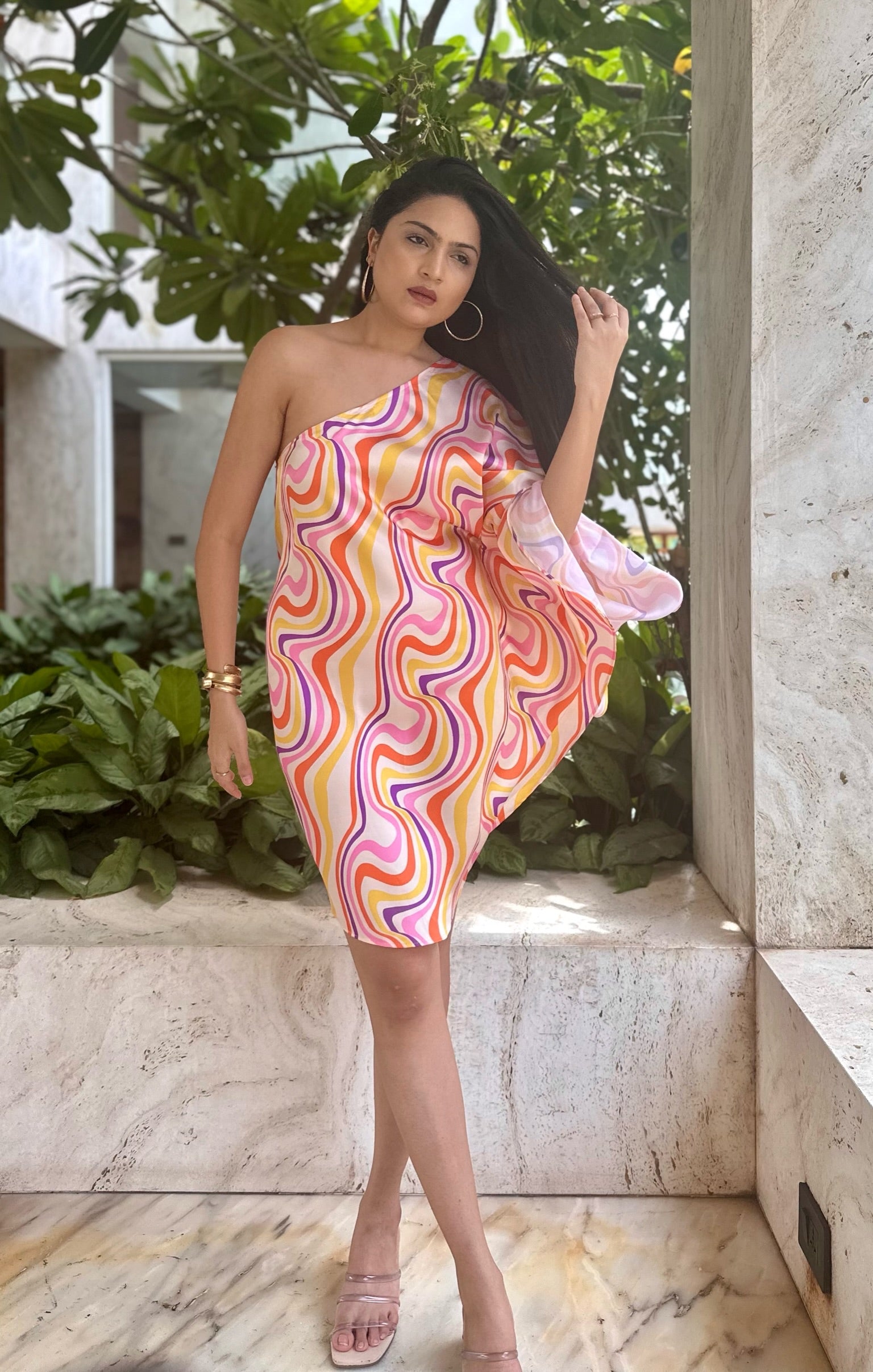 Yes, we can not get over how bold and beautiful this print is. This one shouldered dress has asymmetrical sleeves on one side. Can be worn for any occasion.
