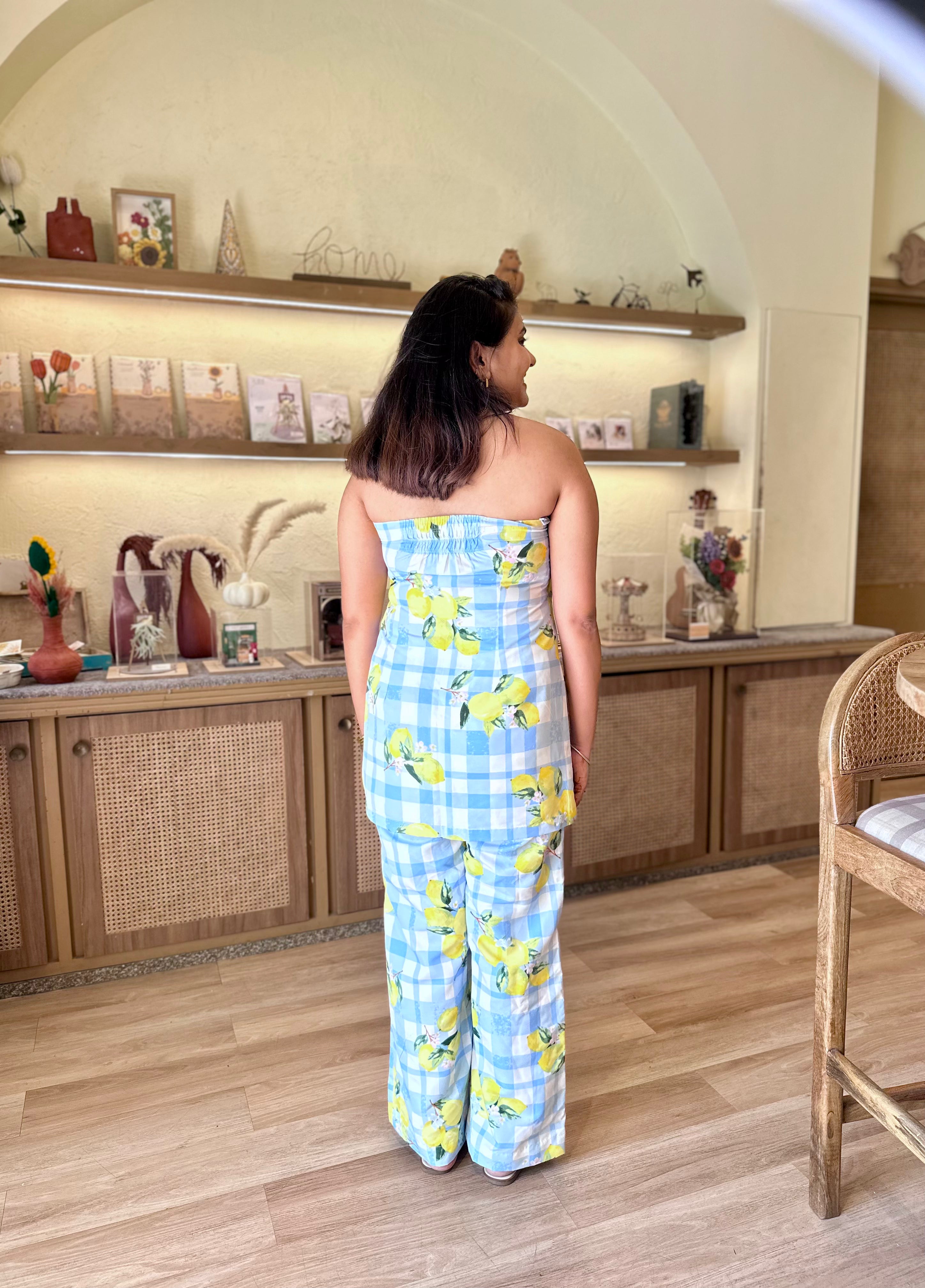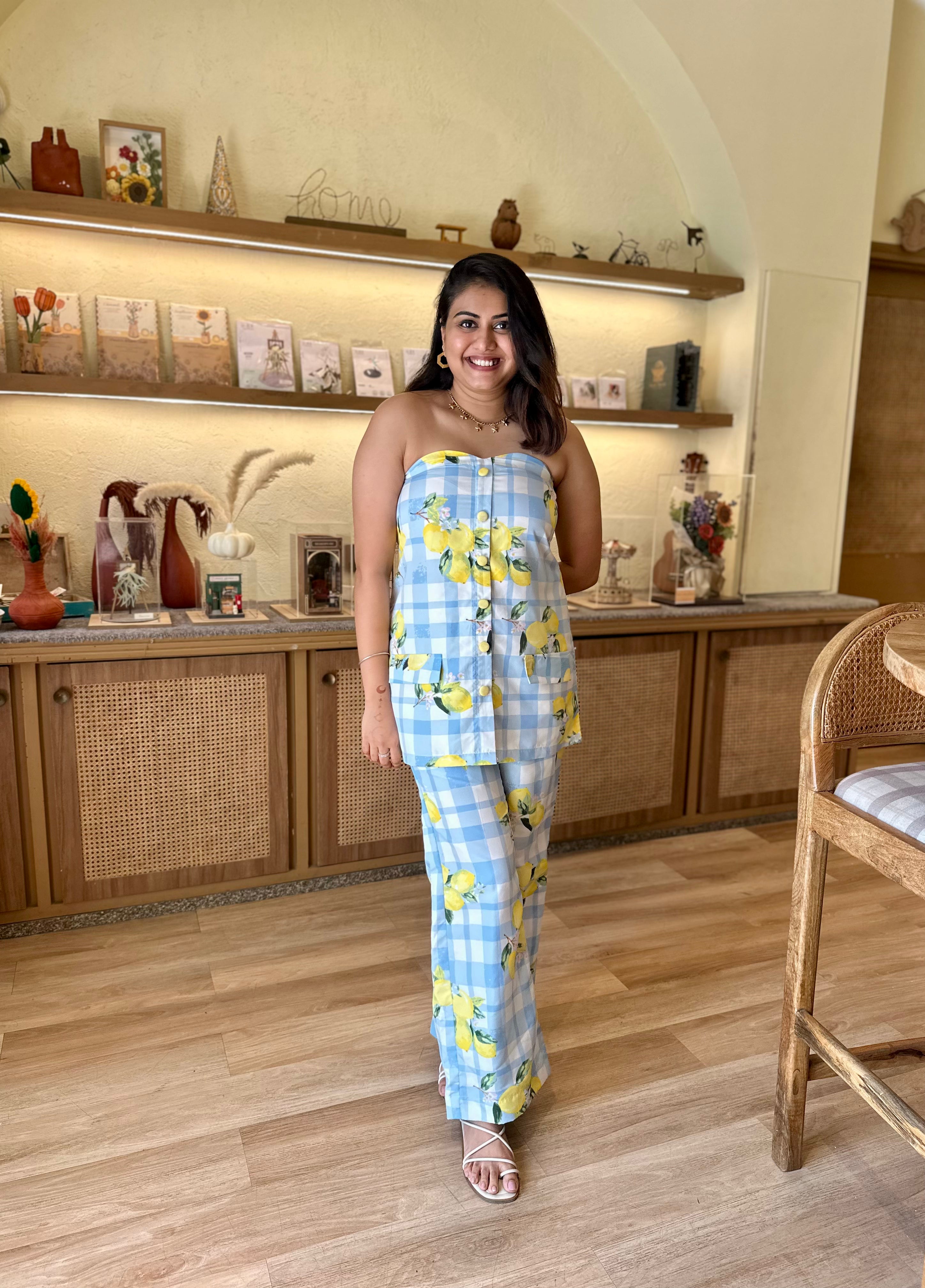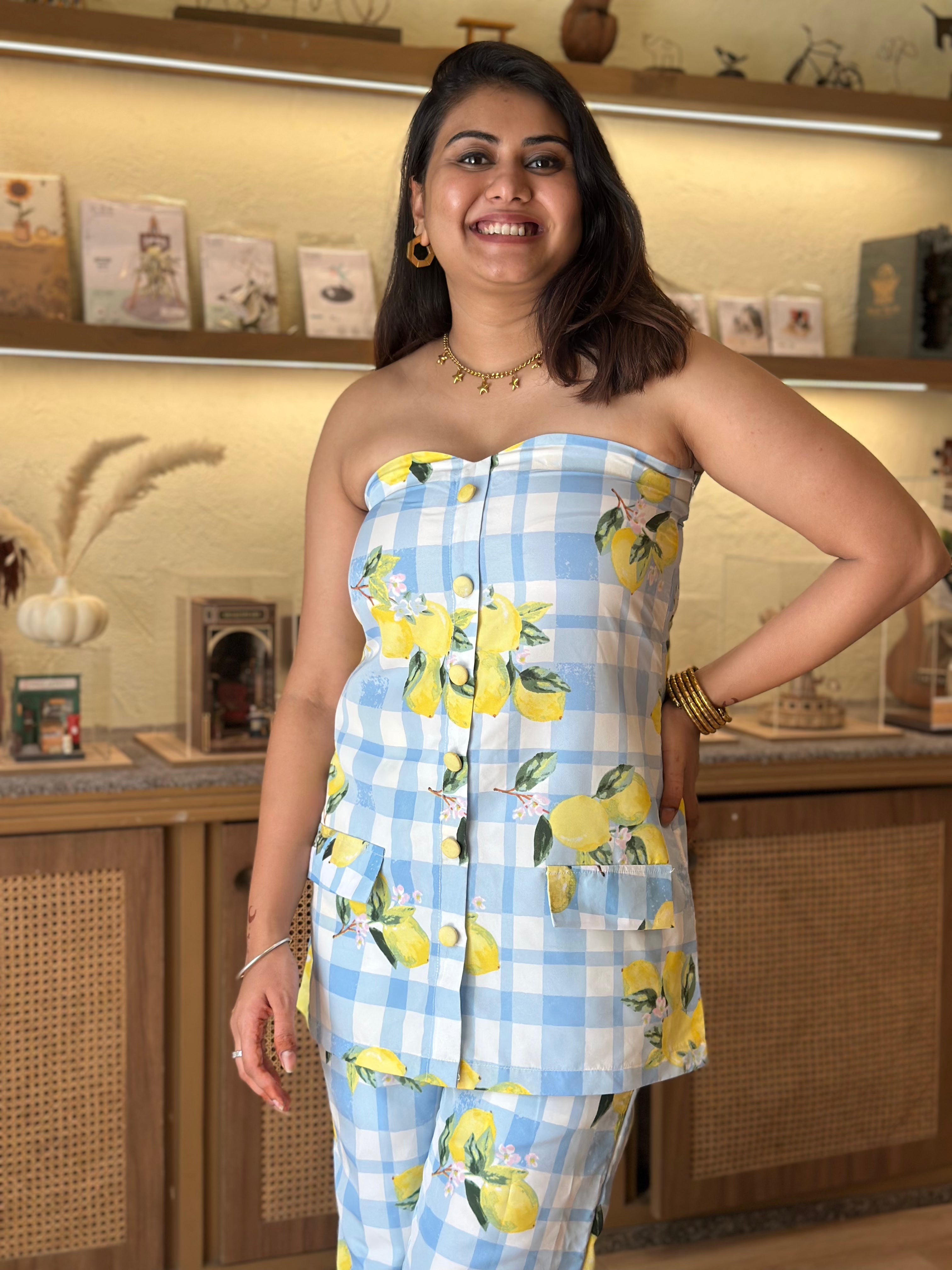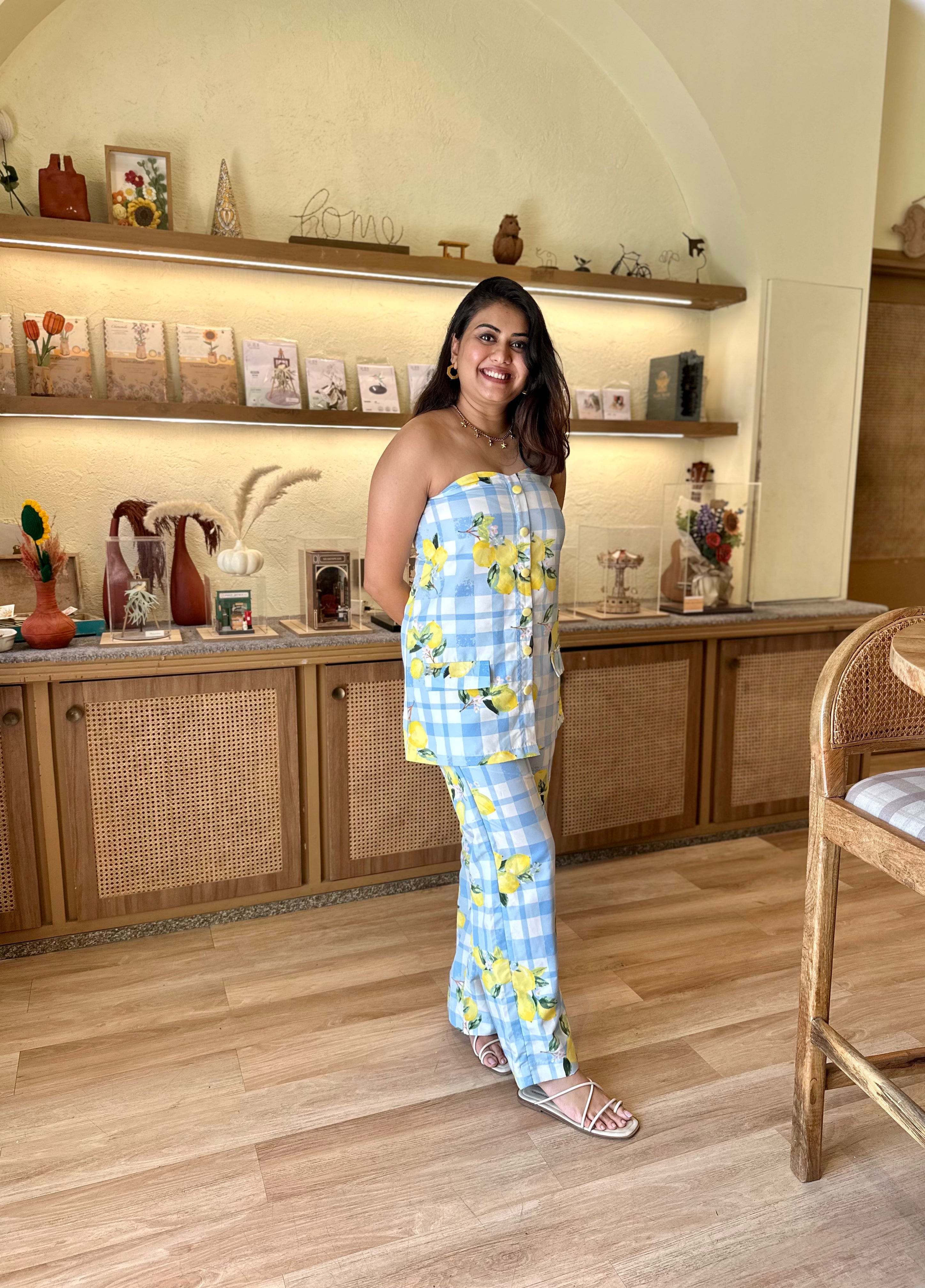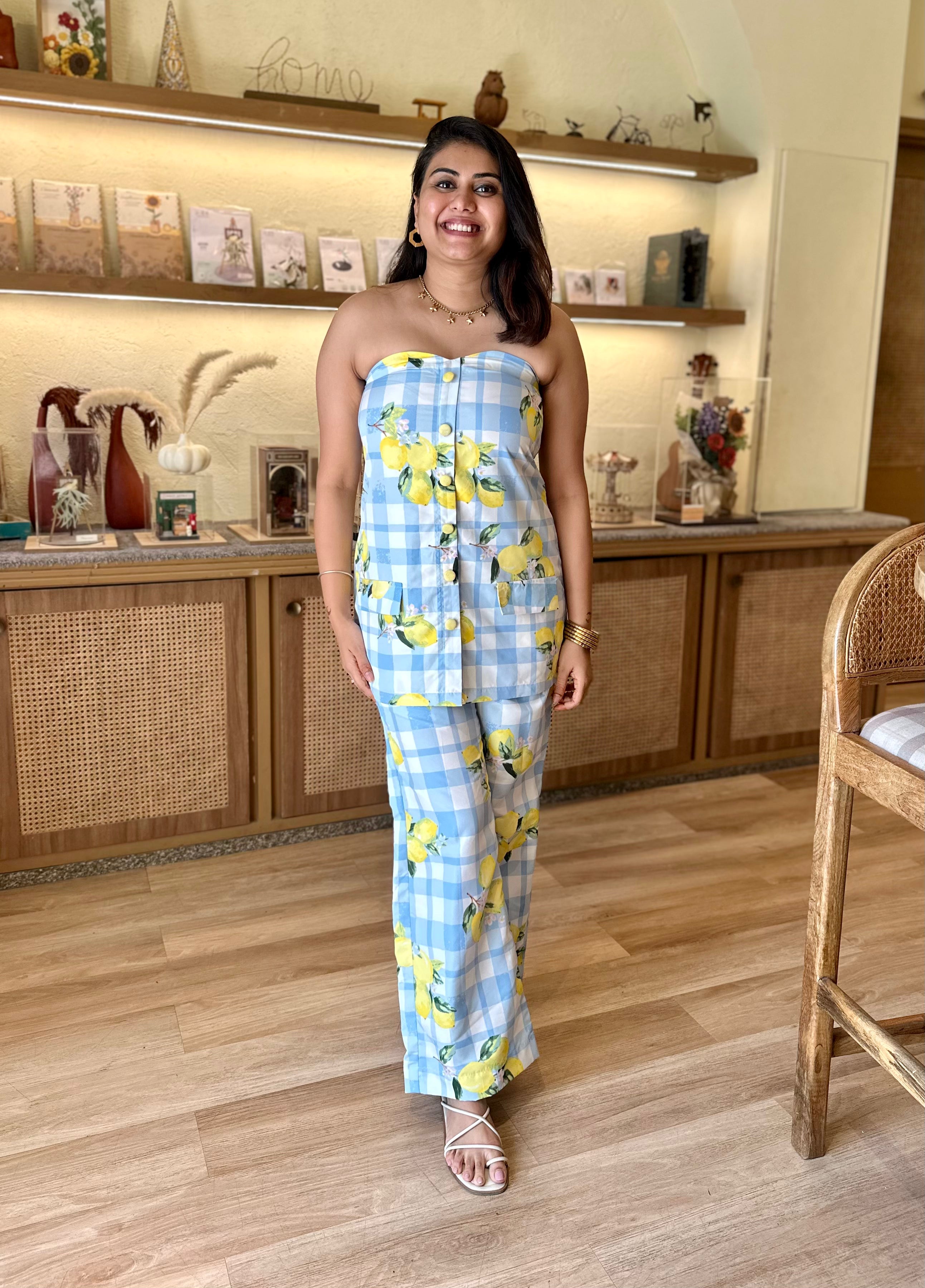 Add a refreshing touch to your look with the Lemon Sorbet Coord Set — a chic and modern ensemble perfect for sunny days or casual outings. The strapless top pairs effortlessly with straight-cut pants featuring pockets, offering both style and practicality. Crafted from soft viscose, it drapes beautifully while keeping you cool and comfortable.