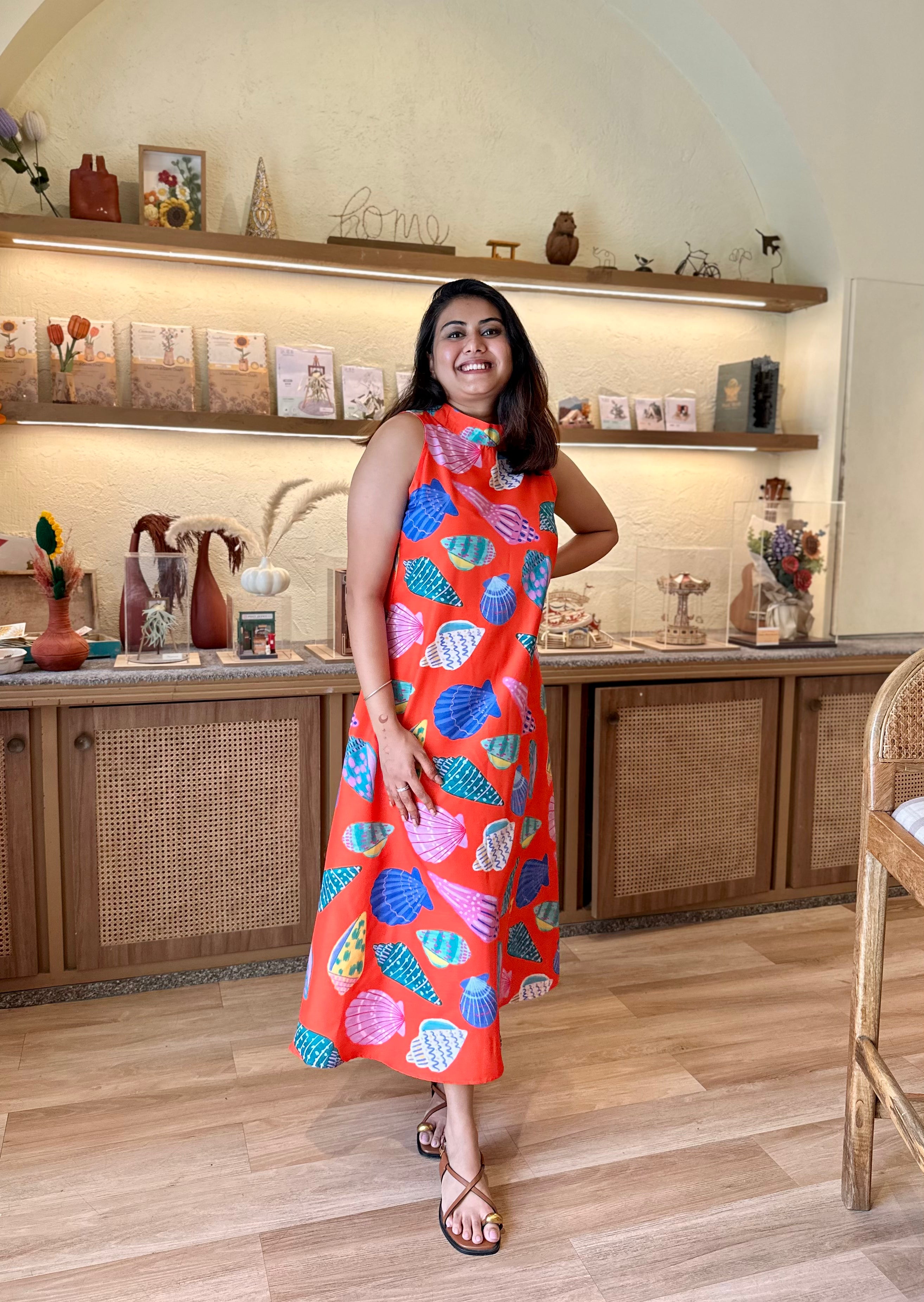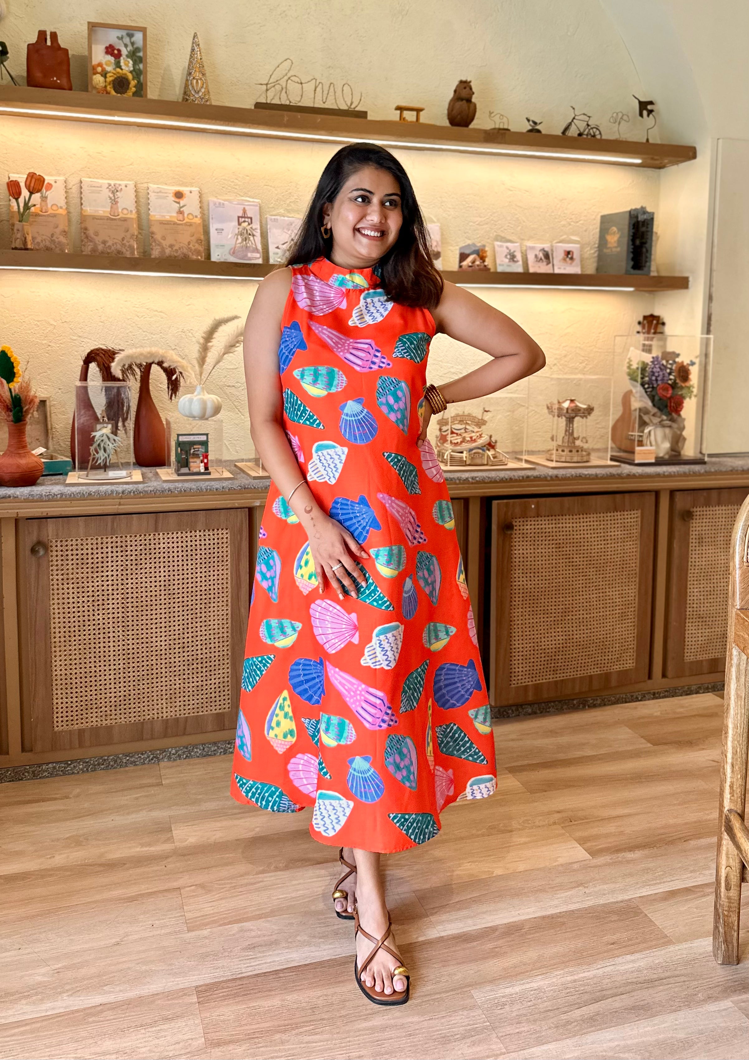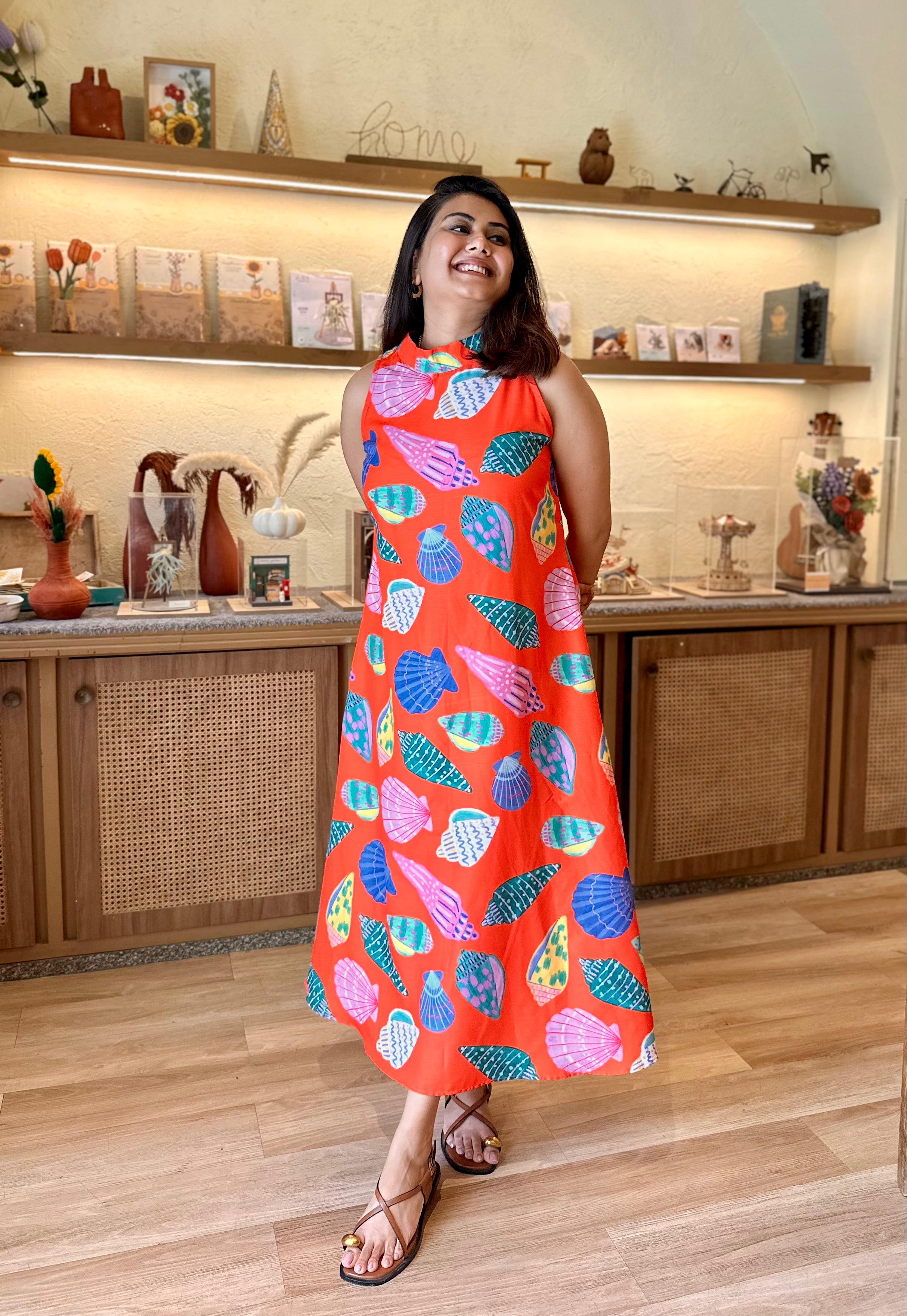 Make a statement with this vibrant orange seashells print dress — a perfect smart-casual piece for any occasion. Designed with a halter neck and handy side pockets, it blends comfort with effortless style. The playful silhouette and breathable AB cotton fabric make it ideal for sunny outings or relaxed evenings.