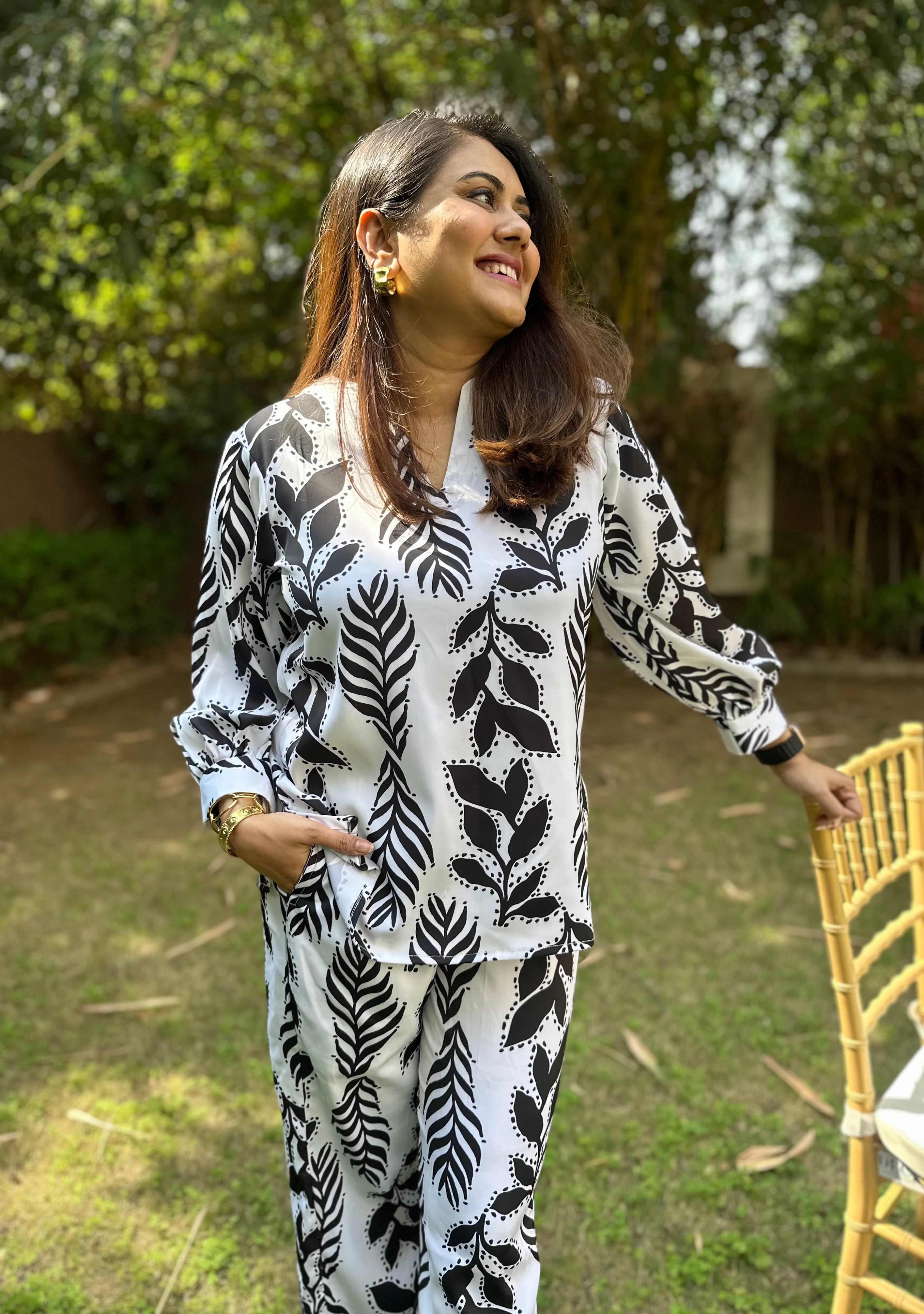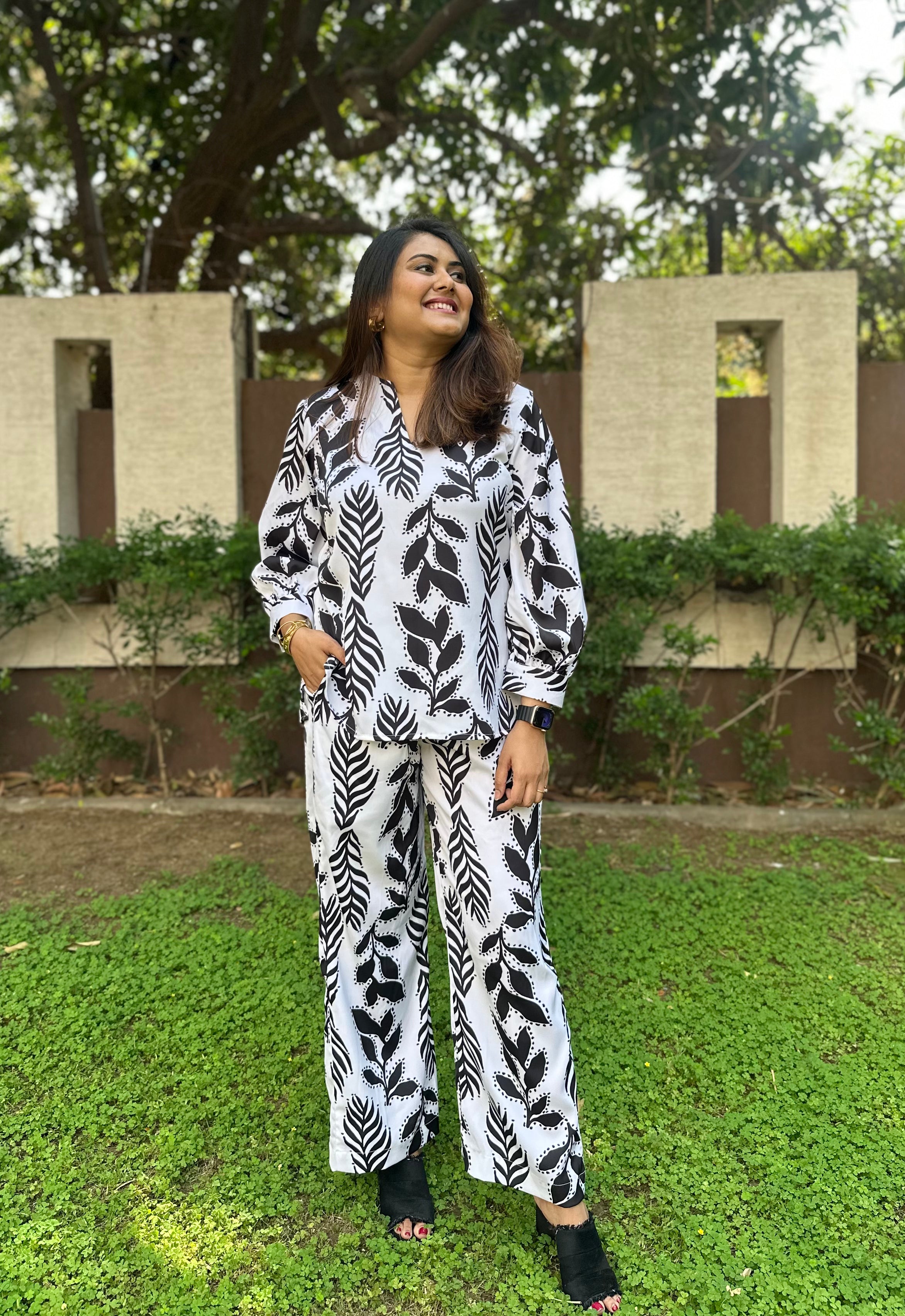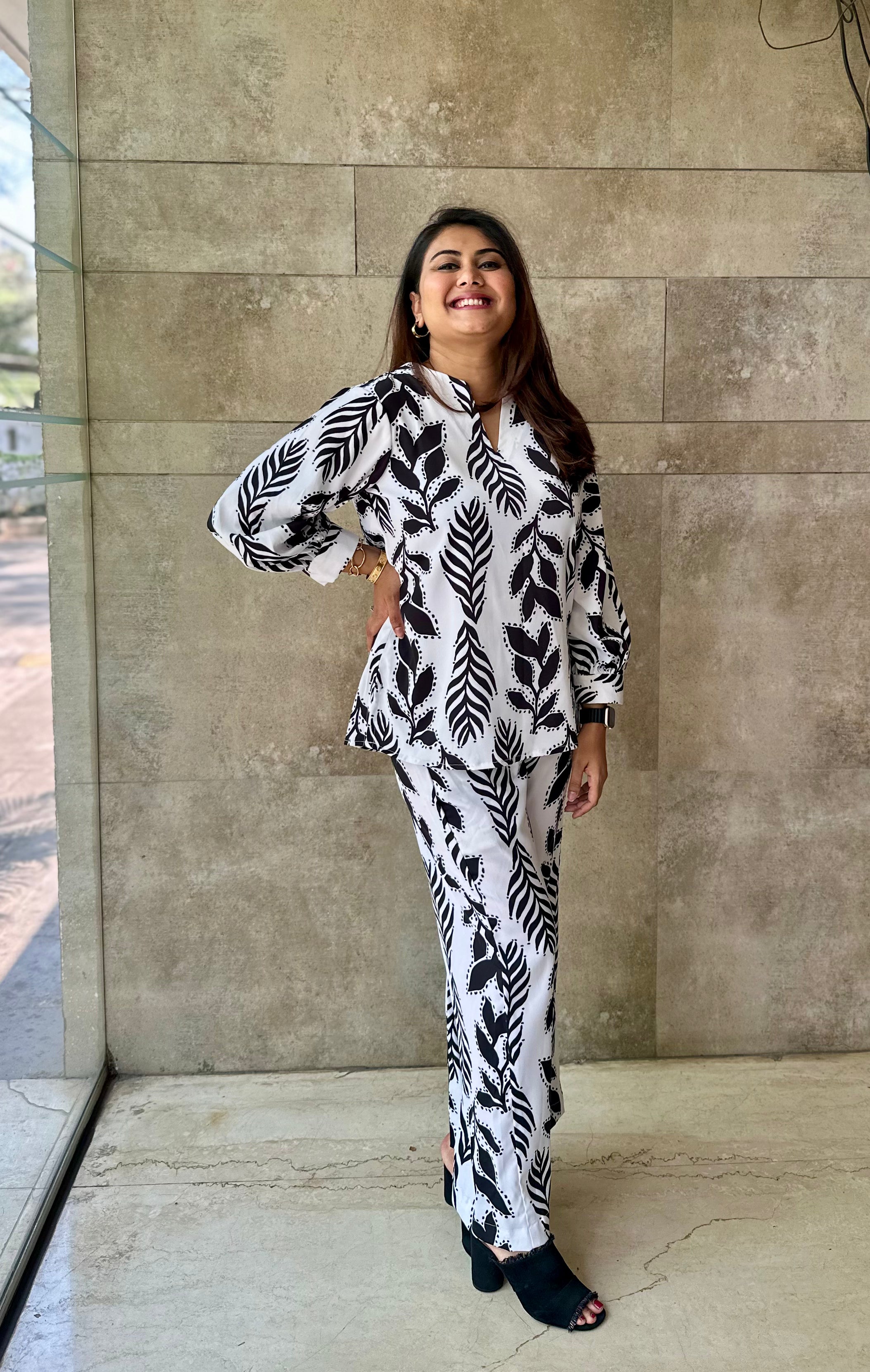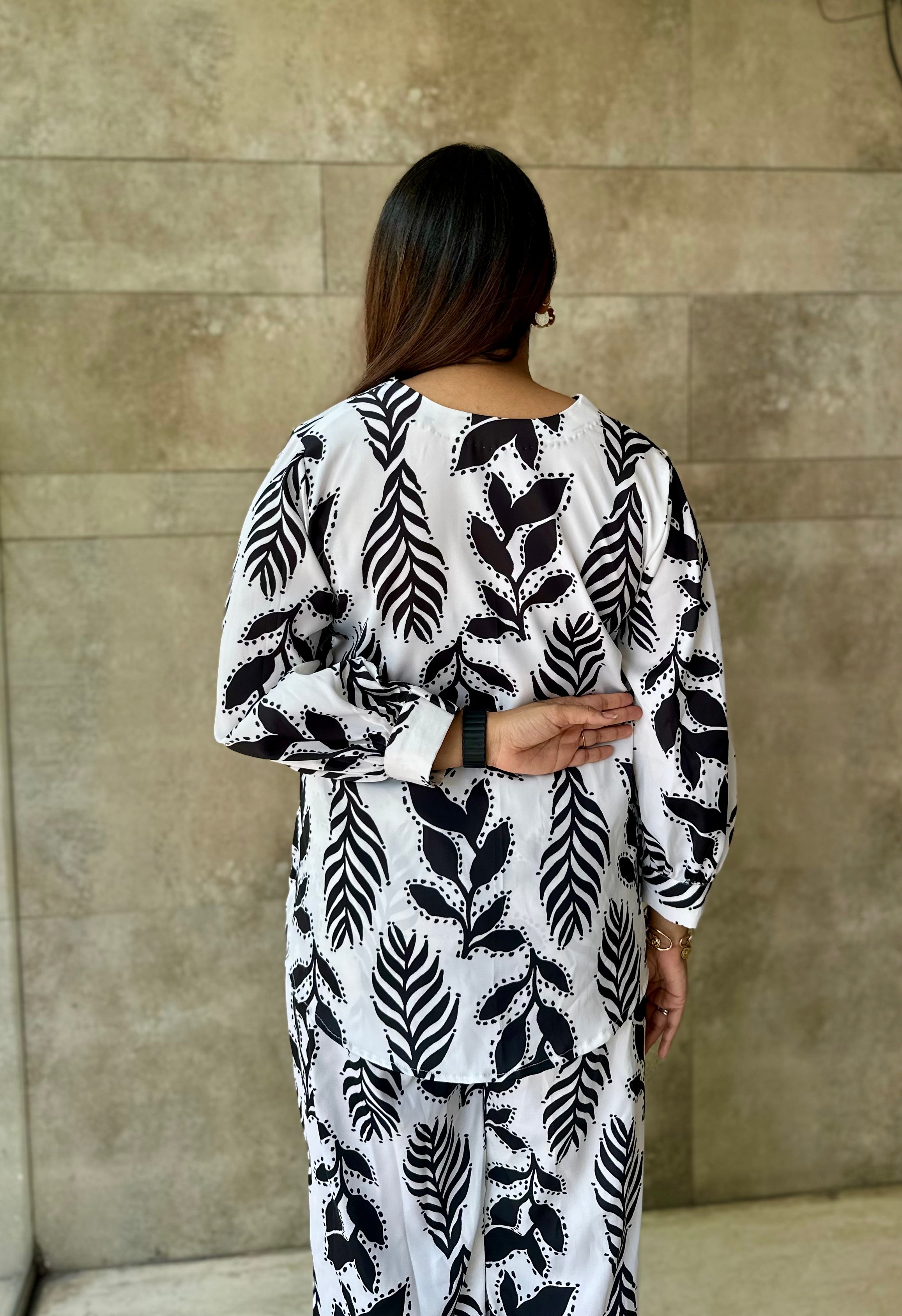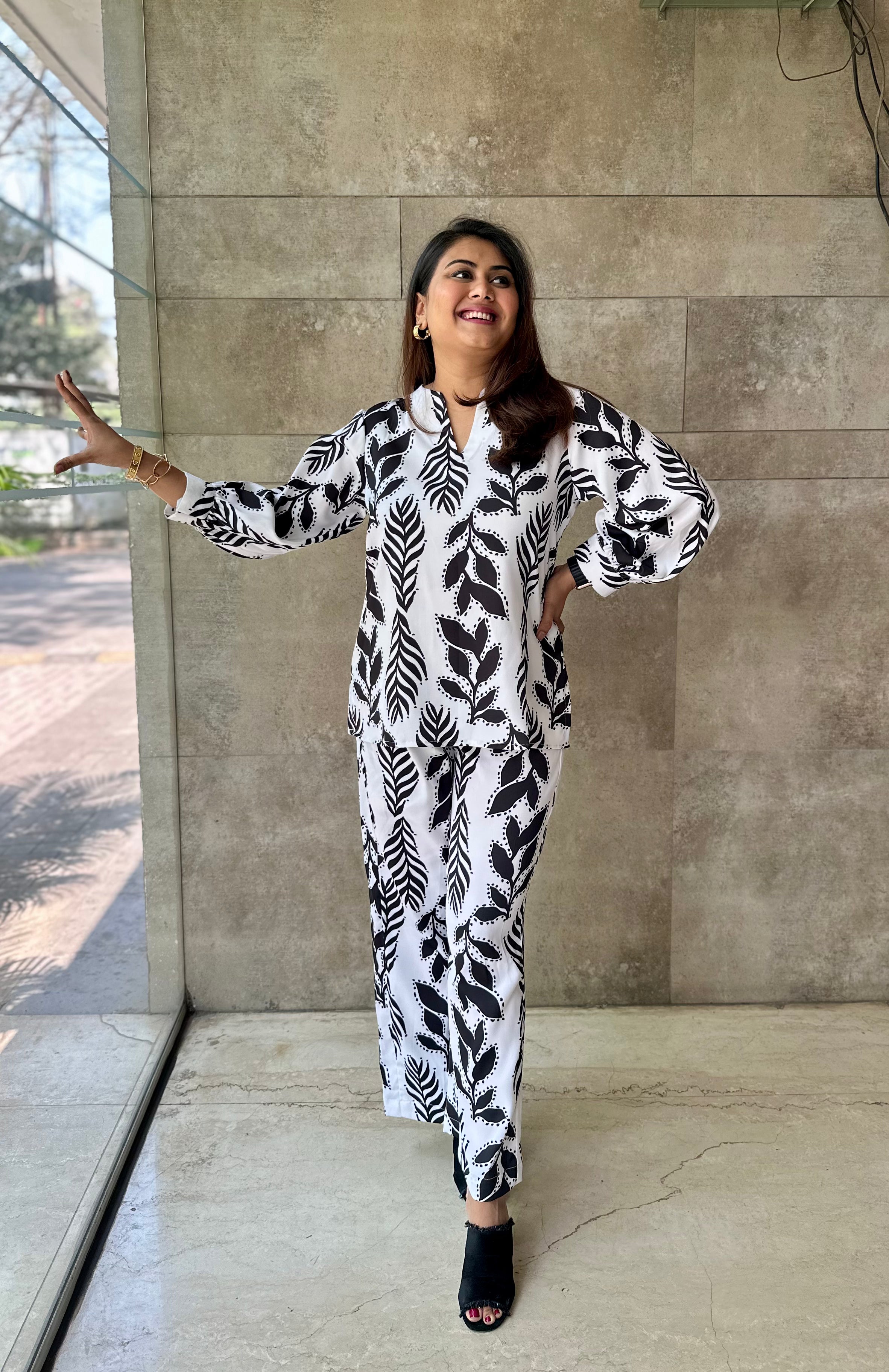 The Black meadow Leaf Print Co-Ord Set features a stylish kurta-style short top with a chic leaf print. The black and white color combo gives it a bold, yet easygoing vibe. The top’s relaxed fit and unique leaf pattern make it stand out, while the coordinating bottom completes the look. Perfect for casual outings or laid-back days, this set is all about effortless style. Pair it with simple jewelry for a fresh, nature-inspired look!