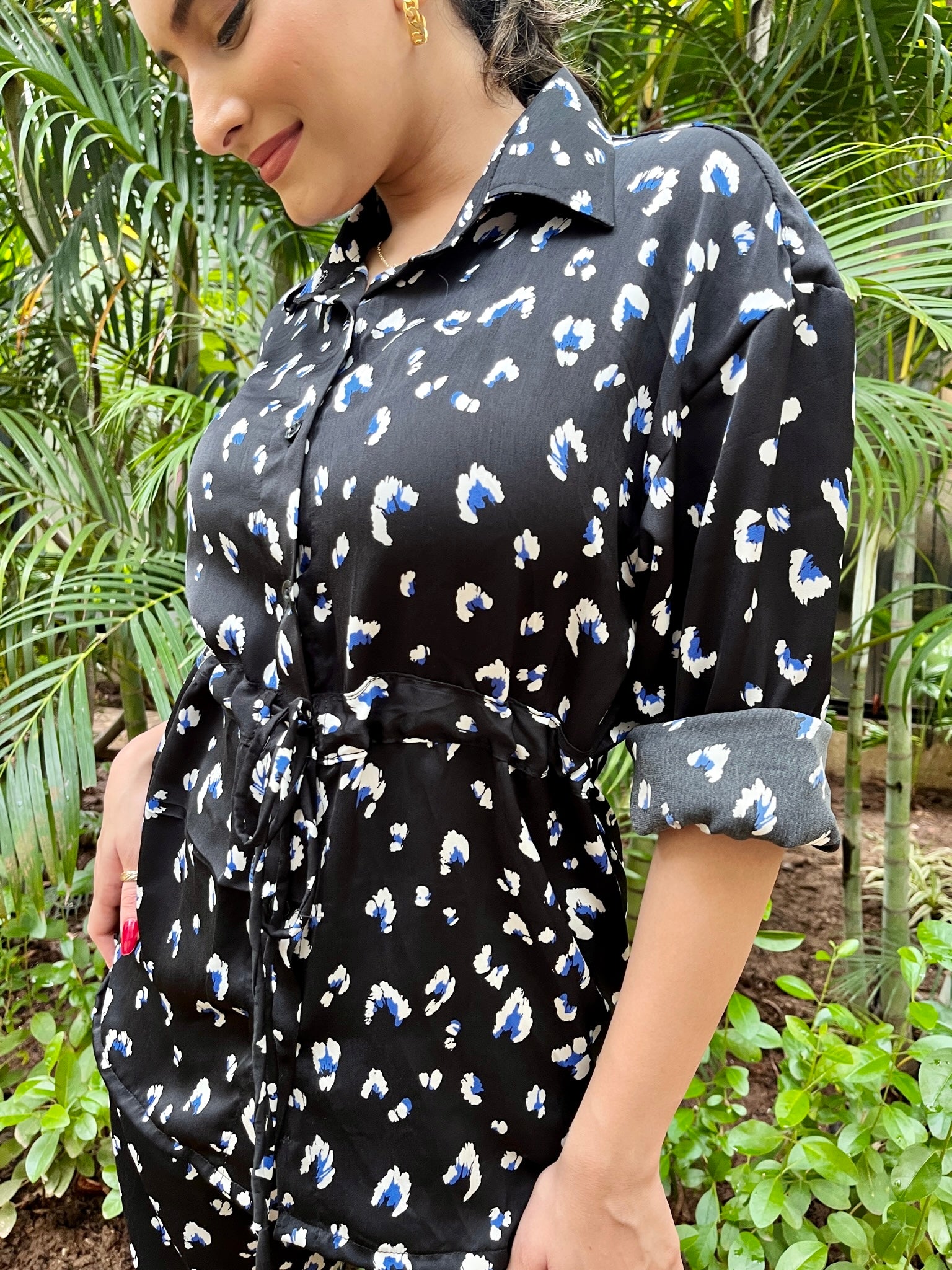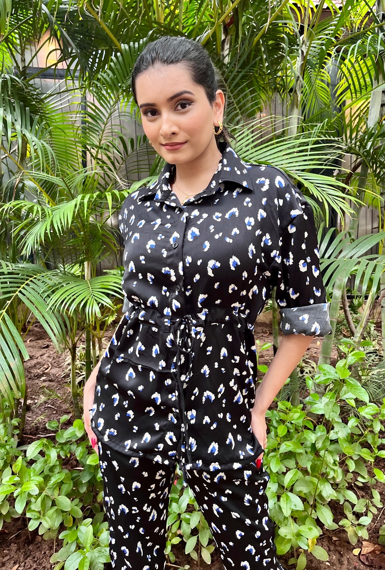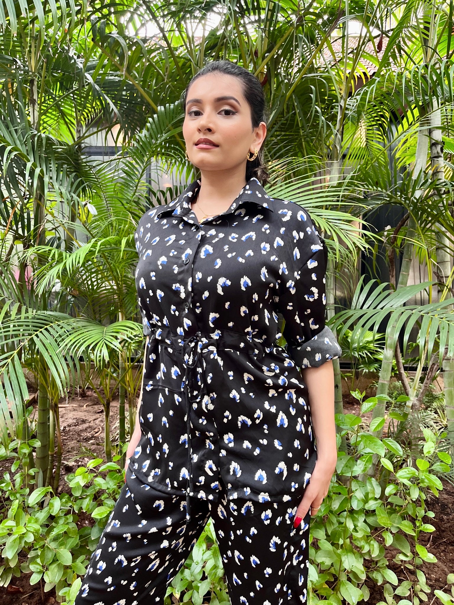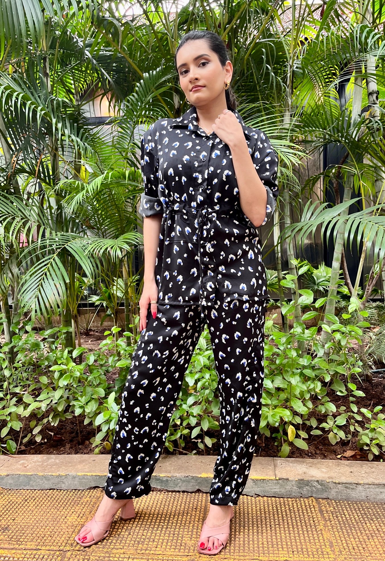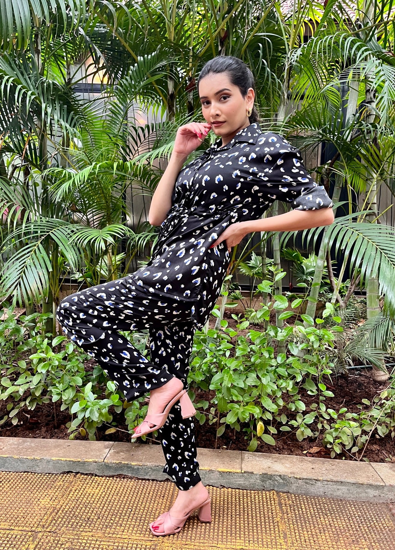 The beauty of satin is, that it works throughout the year. This shirt has high low hem and a drawstring at the waist to adjust the sizing. The matching parallel pants has pockets and comfortable waistband.
