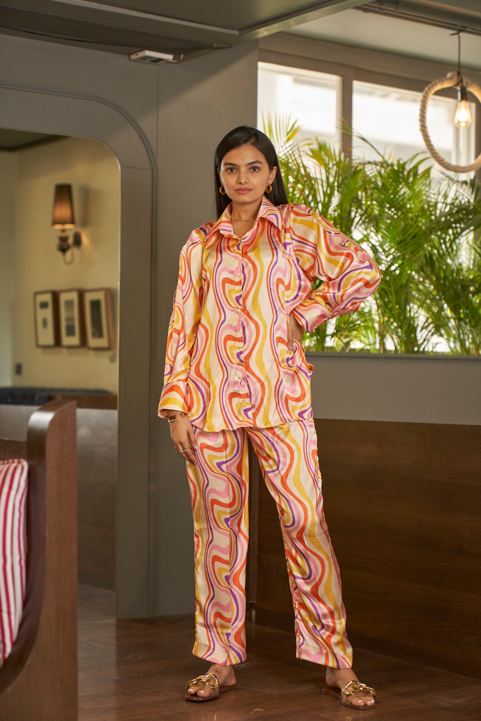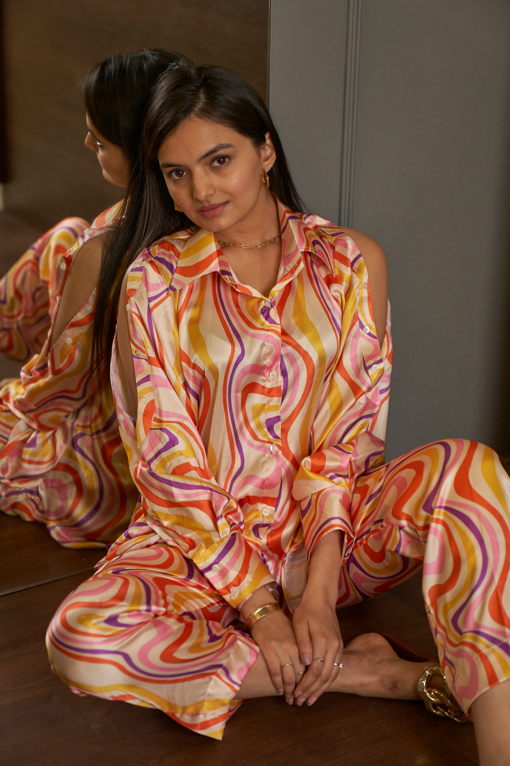 Wearable art, thanks to our groovy pants, made in satin. pair it up with the matching shirt to complete the look.