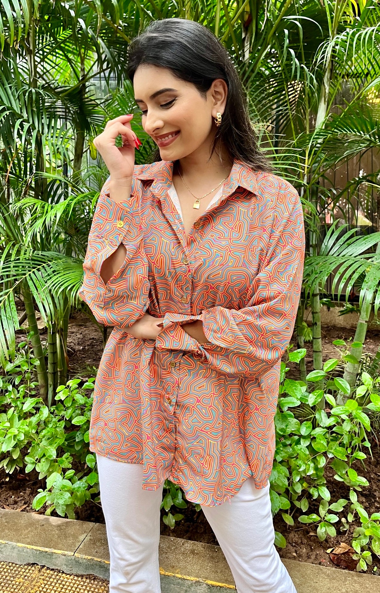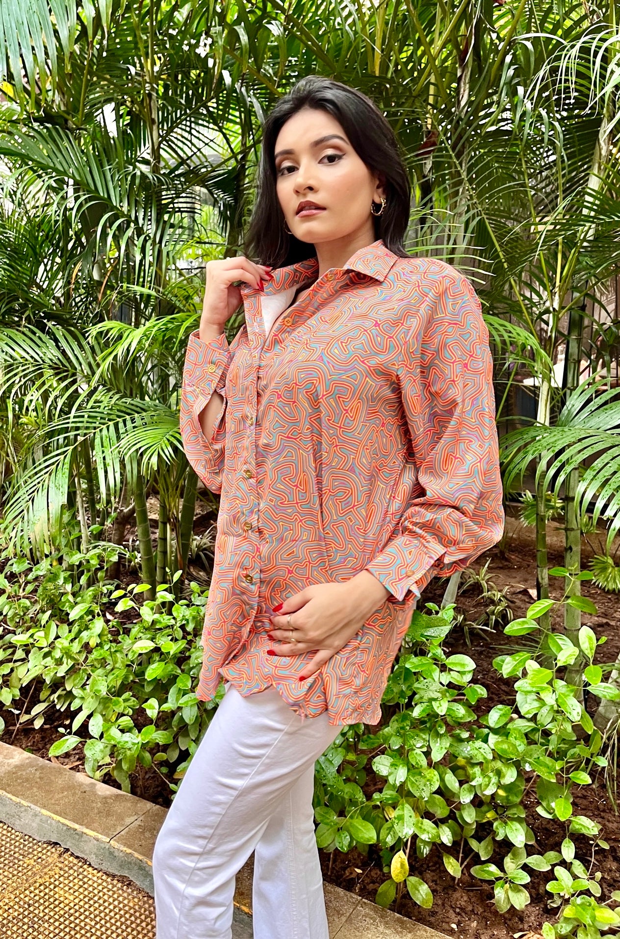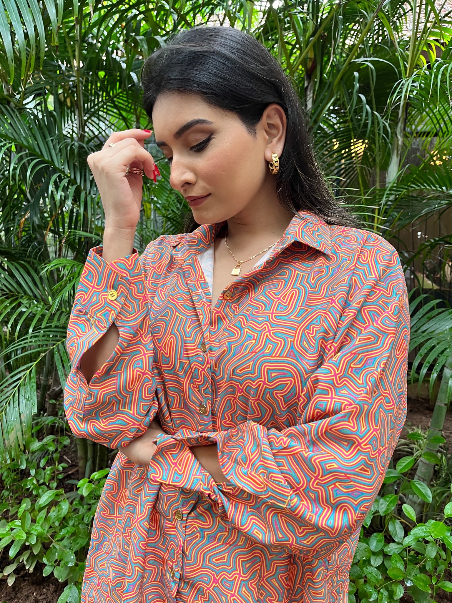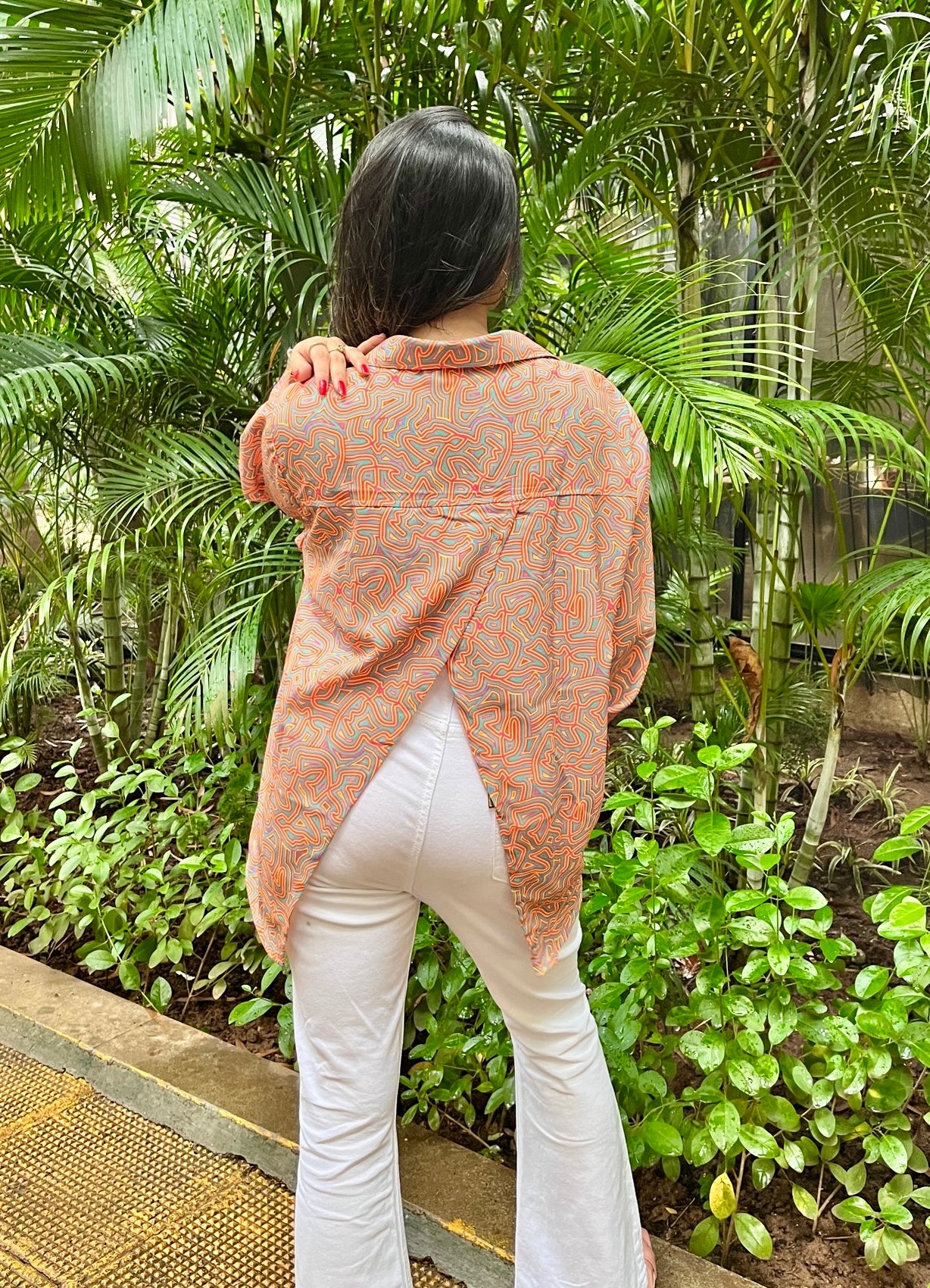 Abstract prints are always new and fun to watch. Introducing our psychedelic print with interesting line work. This shirt features oversized look with golden metallic buttons. The main highlight of this piece is at the back, have a look!
