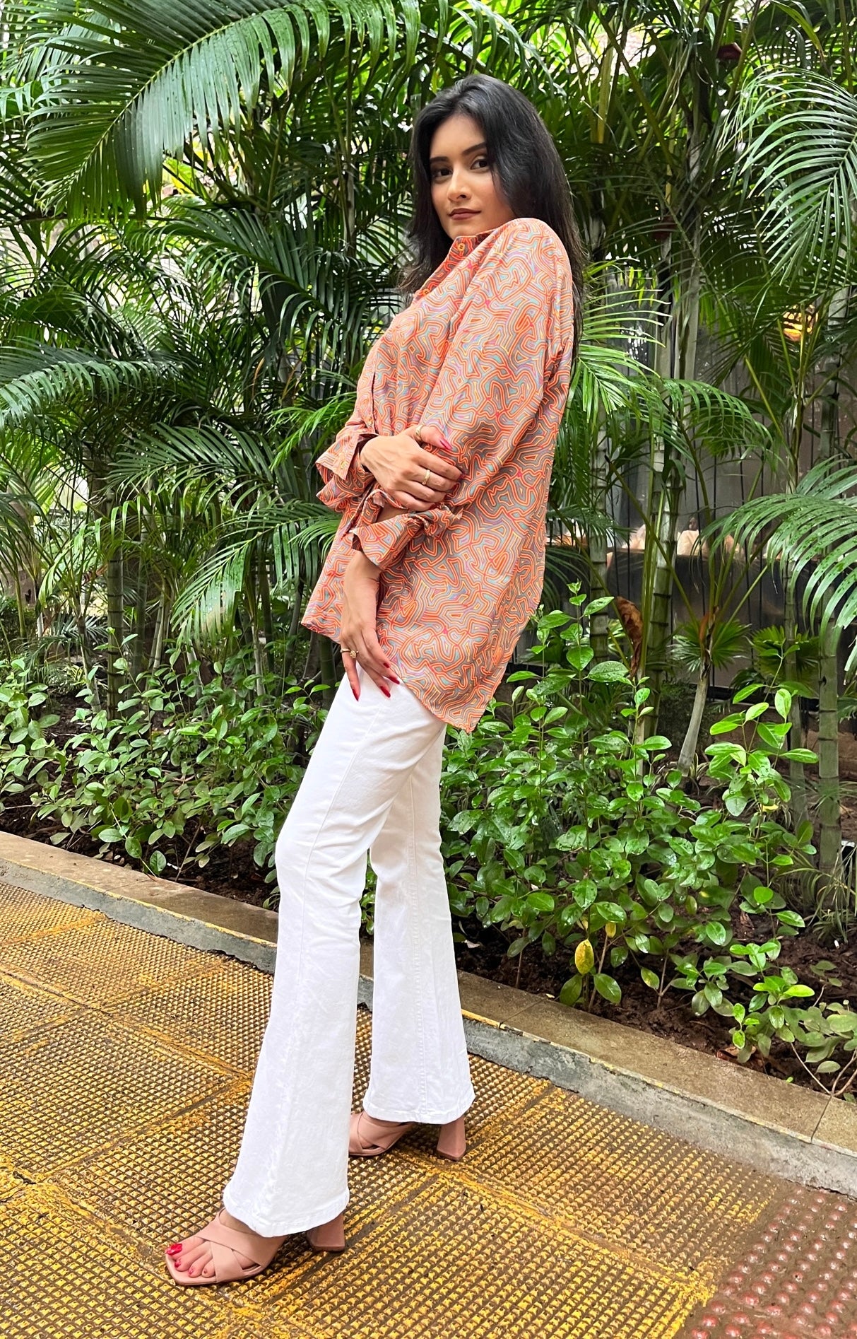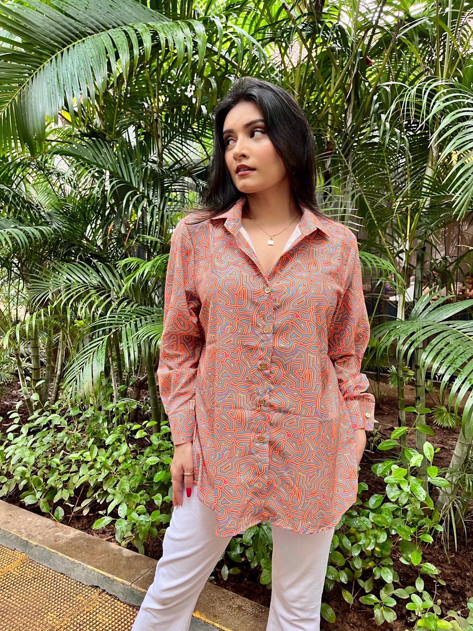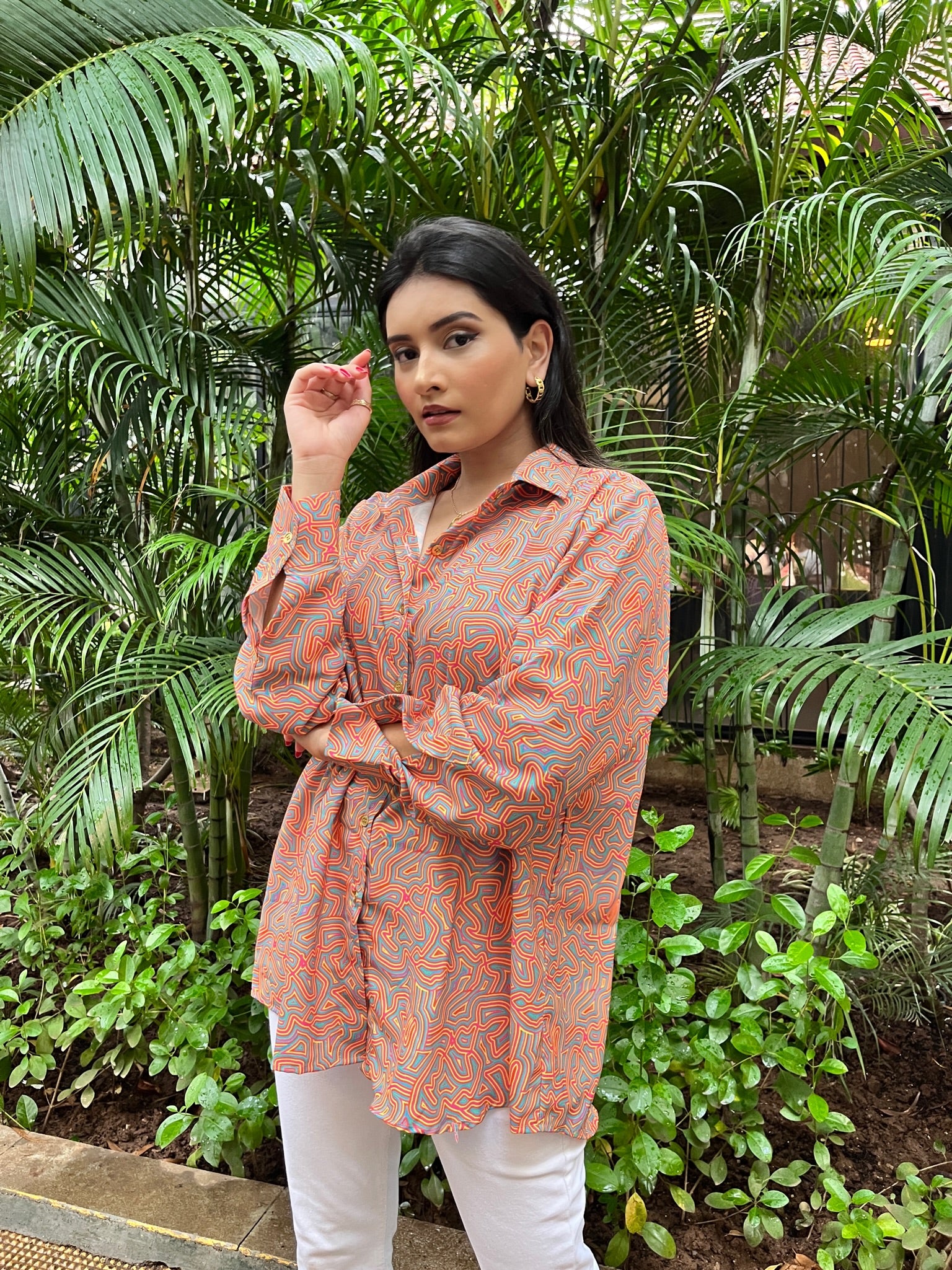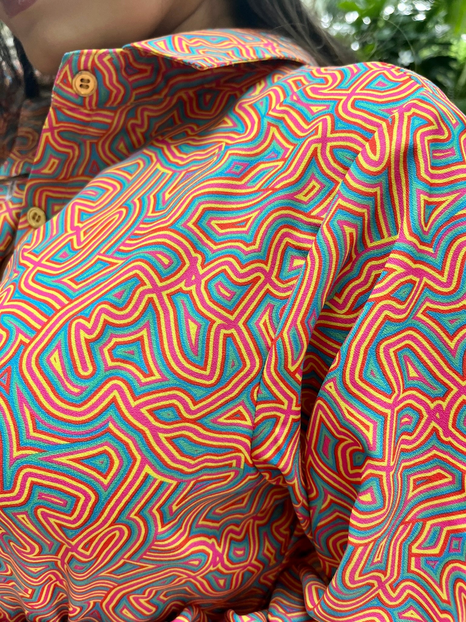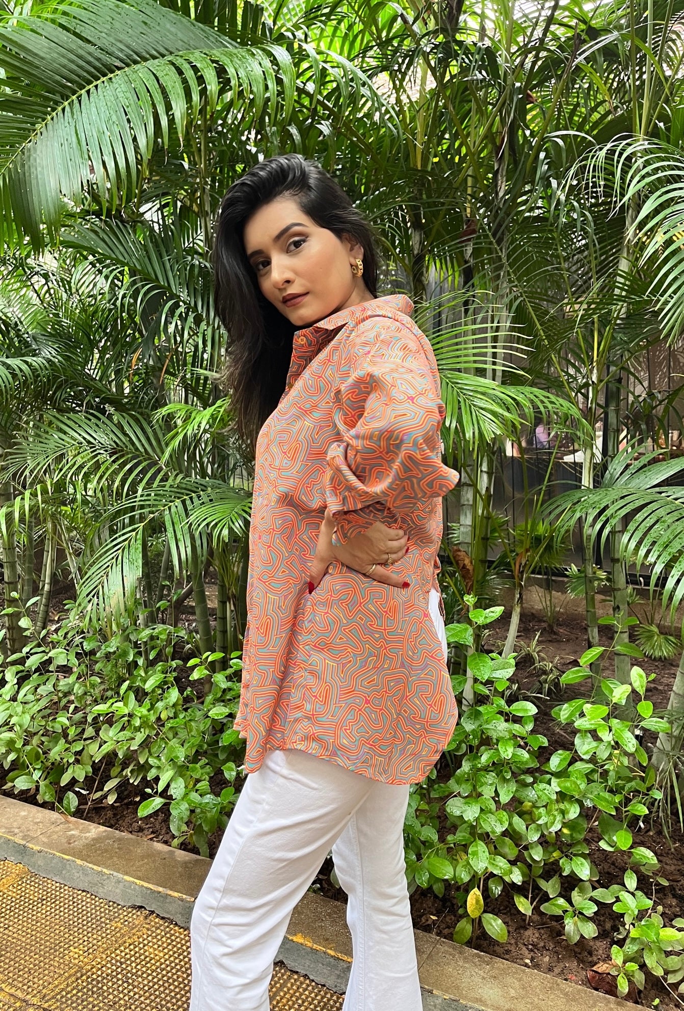 Abstract prints are always new and fun to watch. Introducing our psychedelic print with interesting line work. This shirt features oversized look with golden metallic buttons. The main highlight of this piece is at the back, have a look!