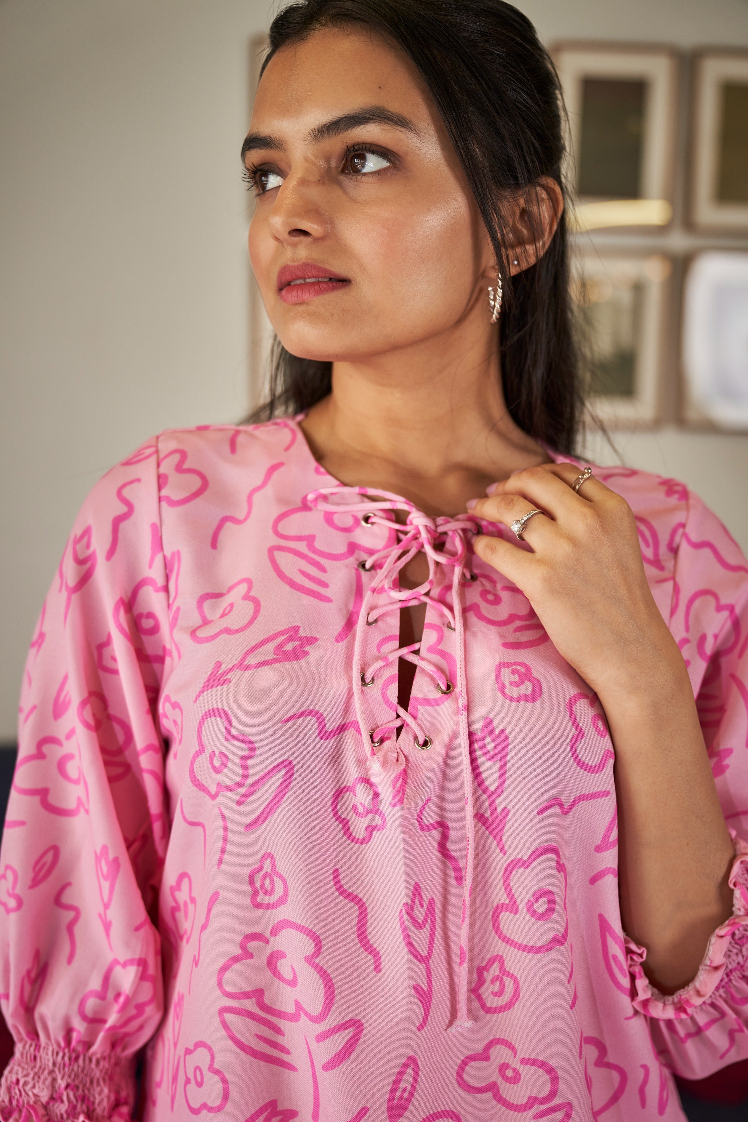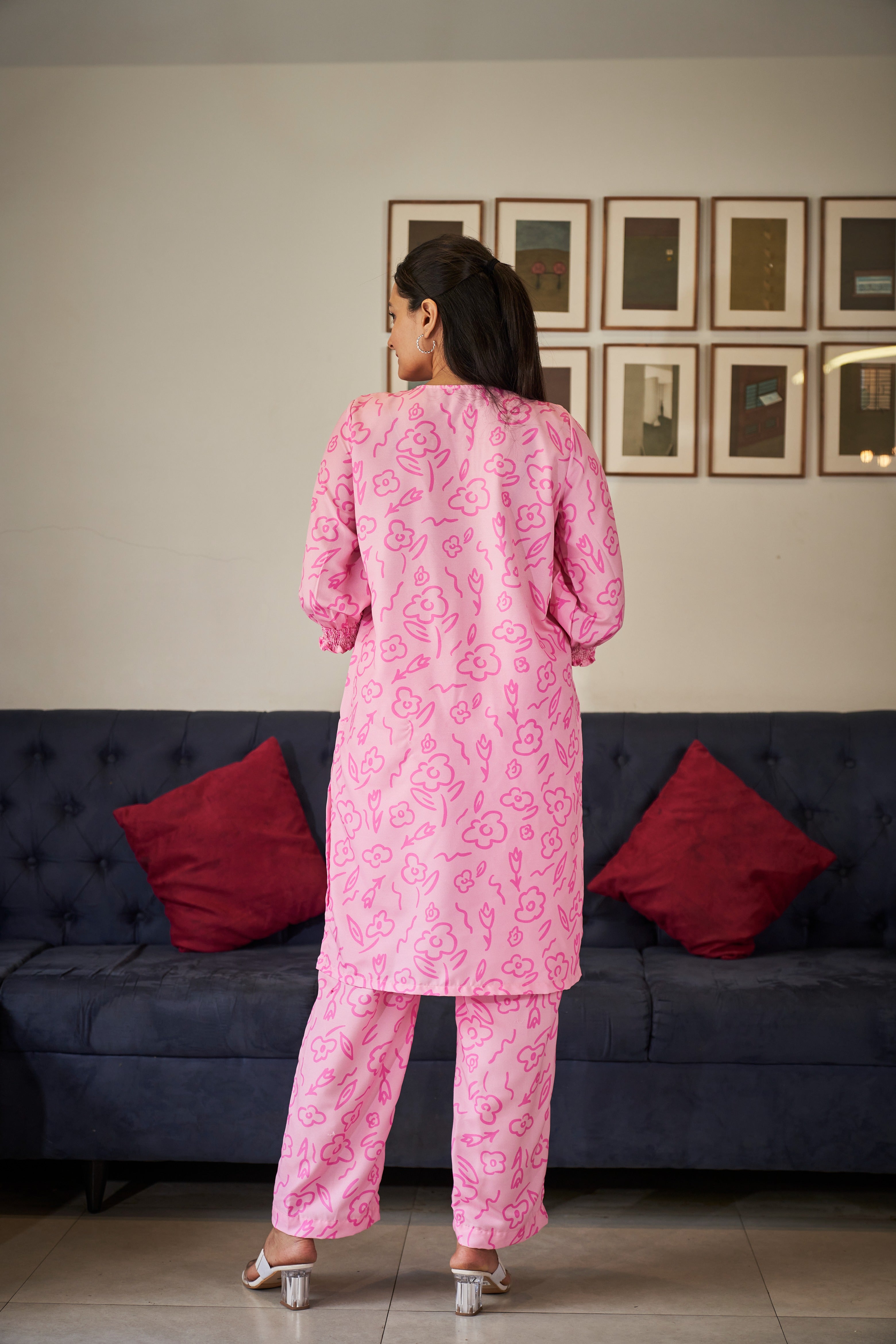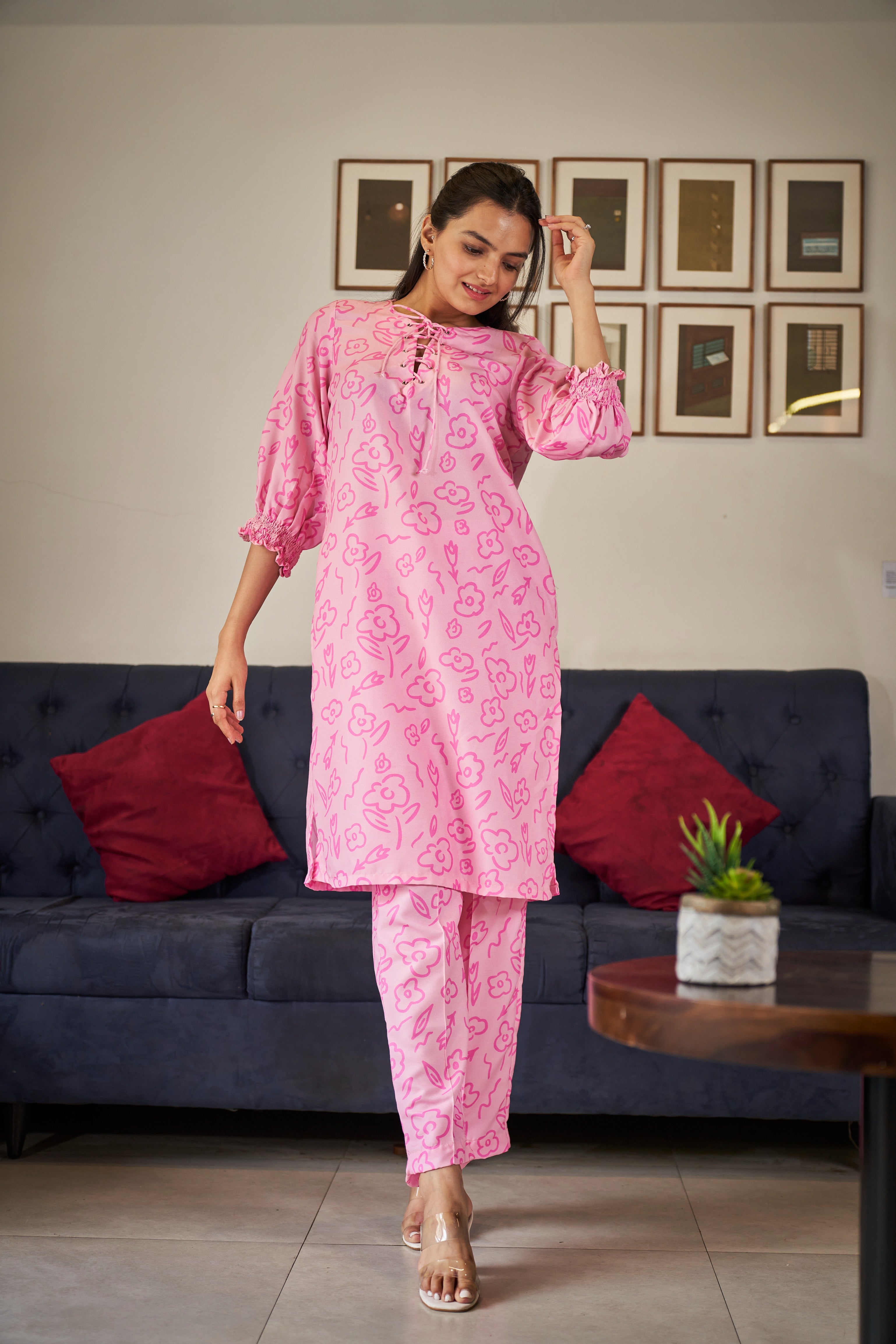 Why settle for basic coordset when you can make statement with our peony kurta set! This set features easy front seam pants and neck tieup kurta set with smocked sleeves.