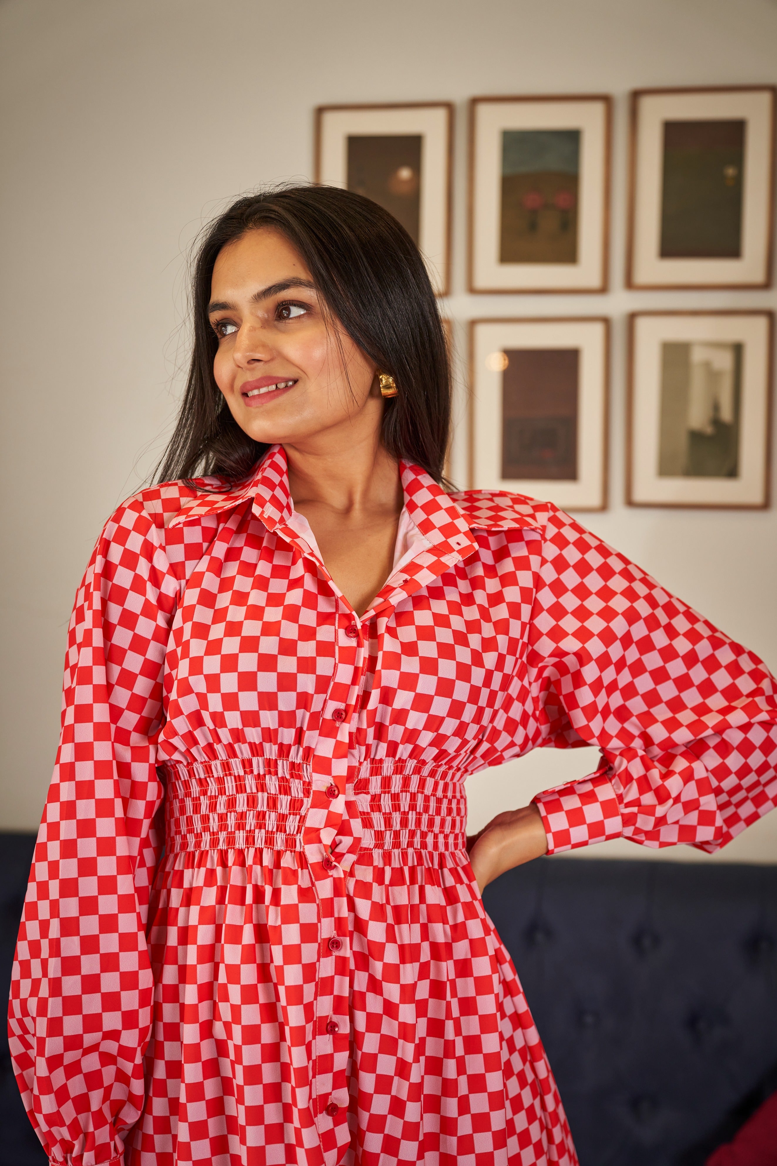 Did someone say chic? Our checkered dress has a shirt style silhouette that is completely button down with smocked waist to celebrate your waistline.