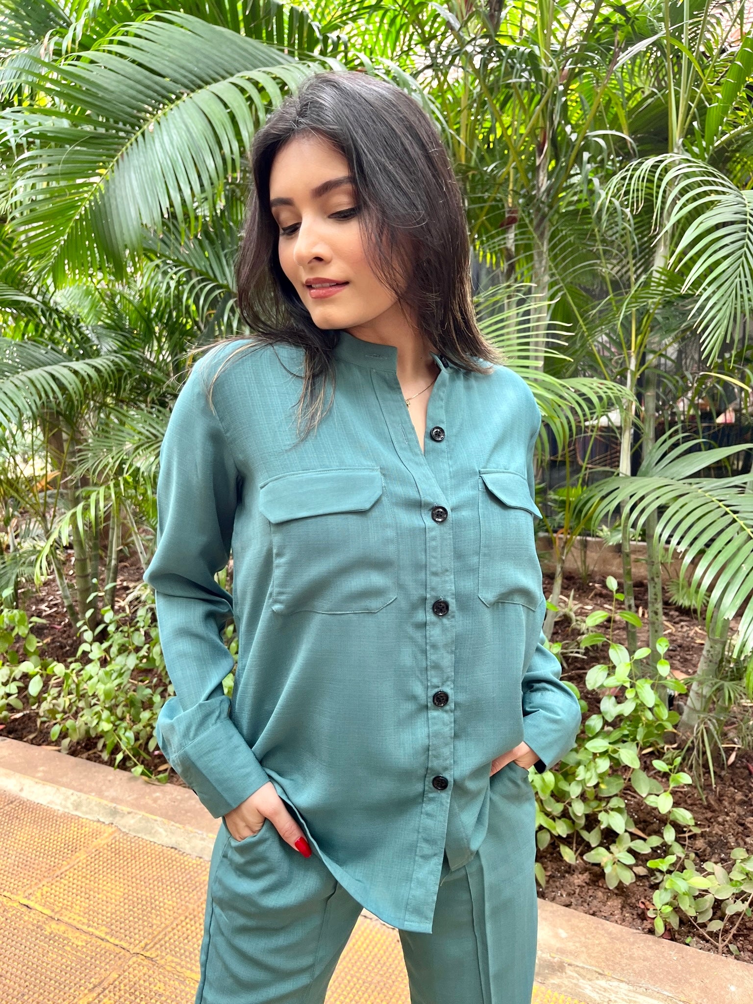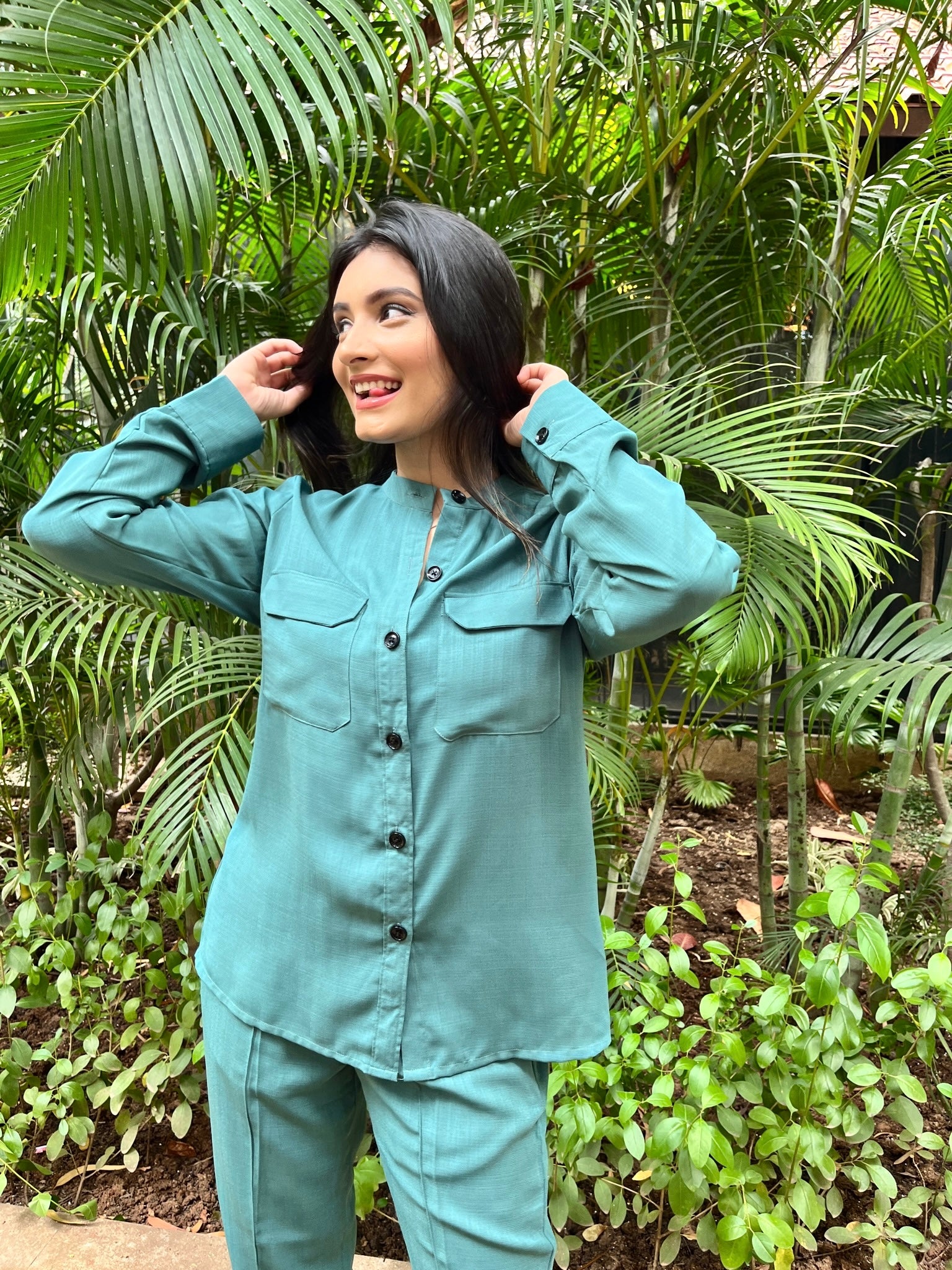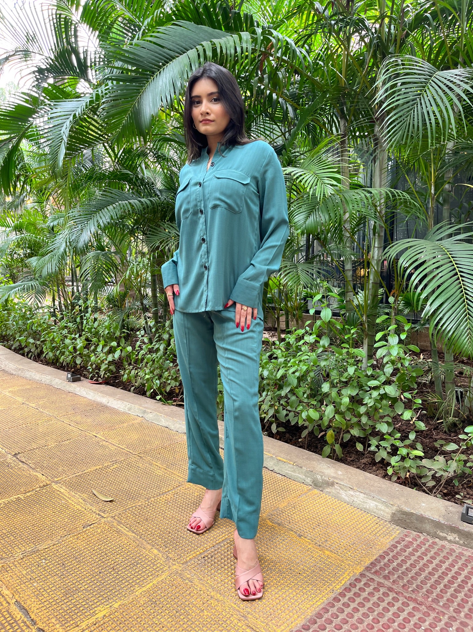 This front sewn pleated pant features elasticated band to sit perfectly at your waist. It has two hidden pockets. pair it up with our teal green shirt to complete your lounge look.
