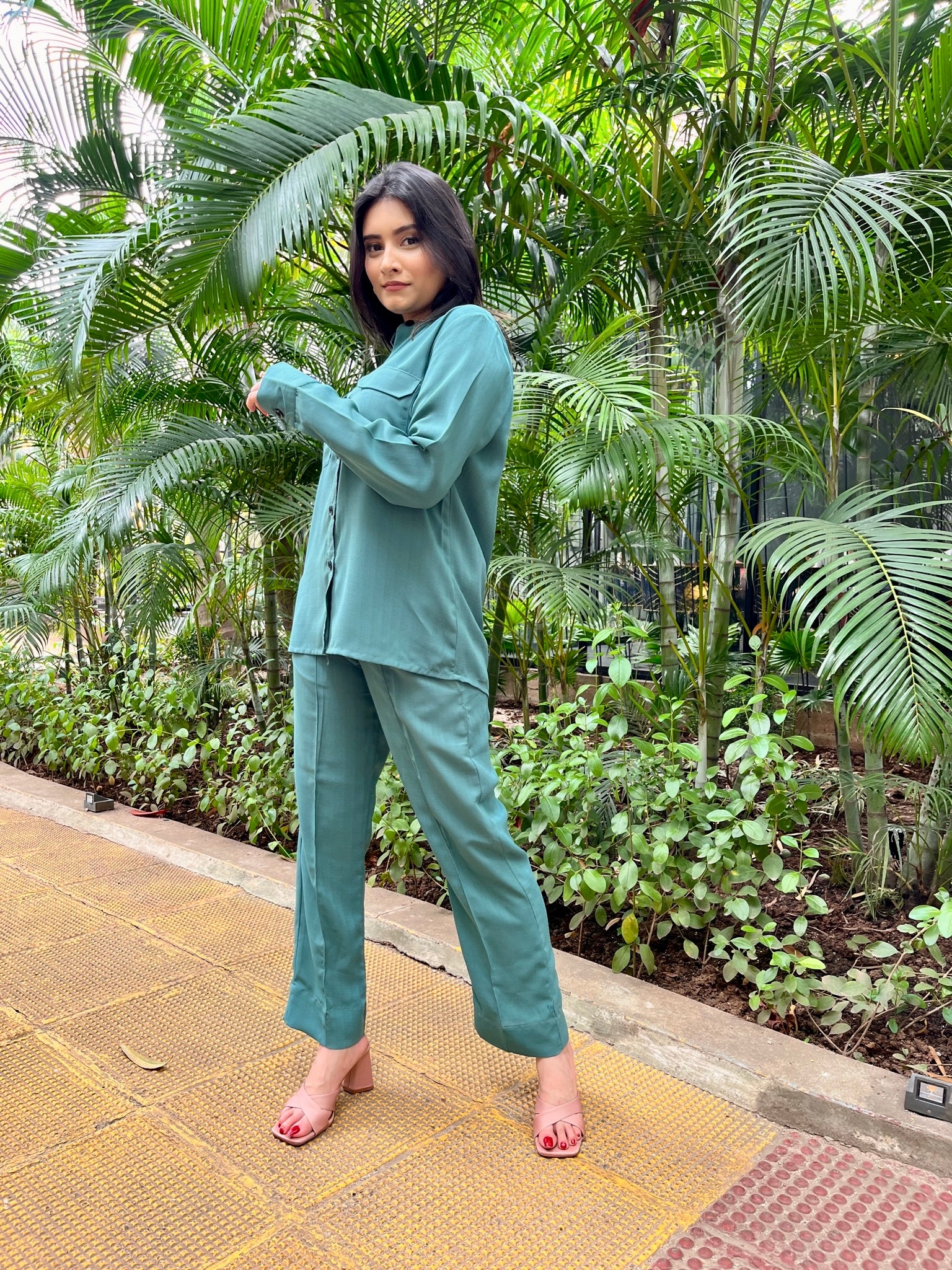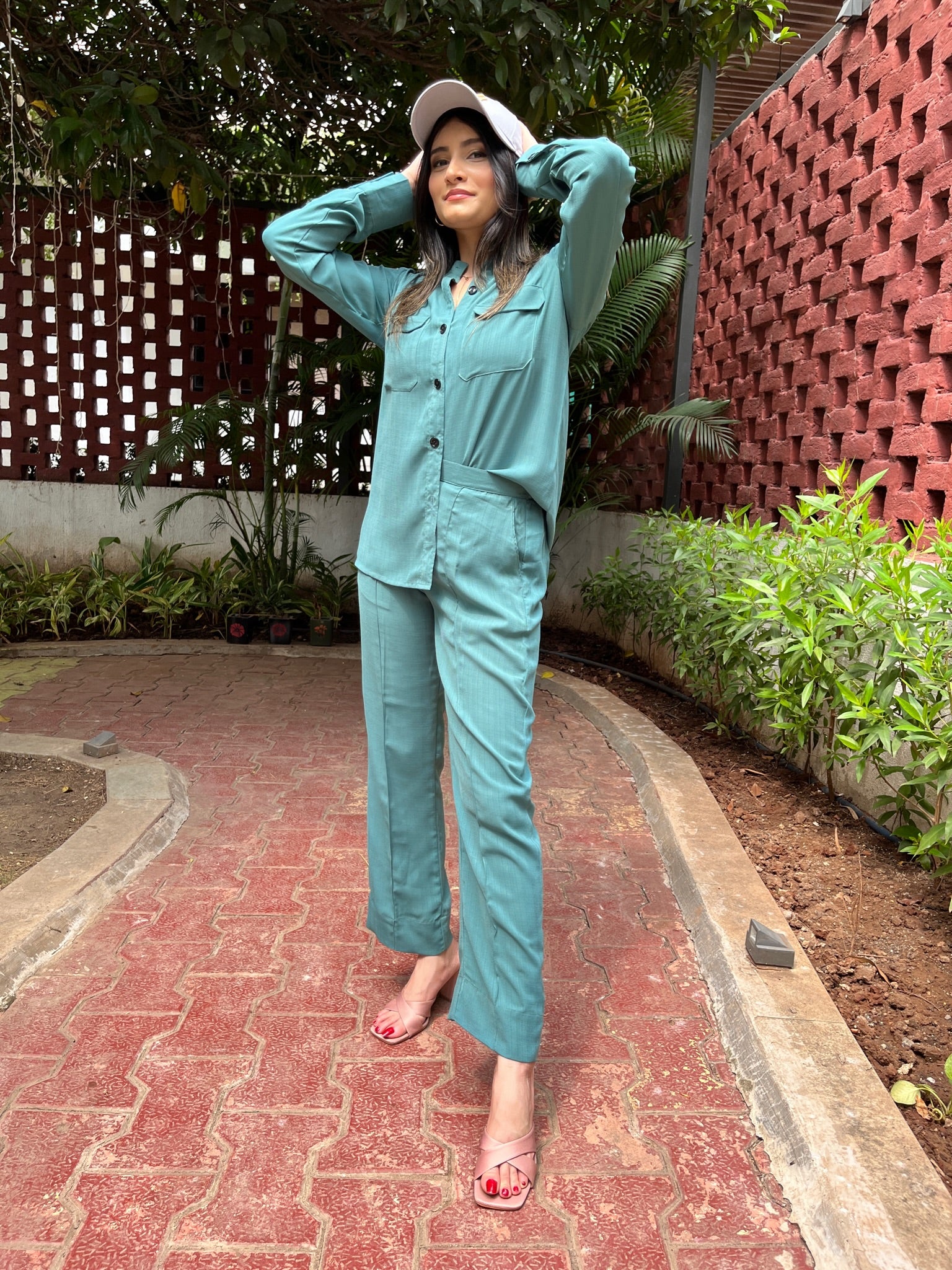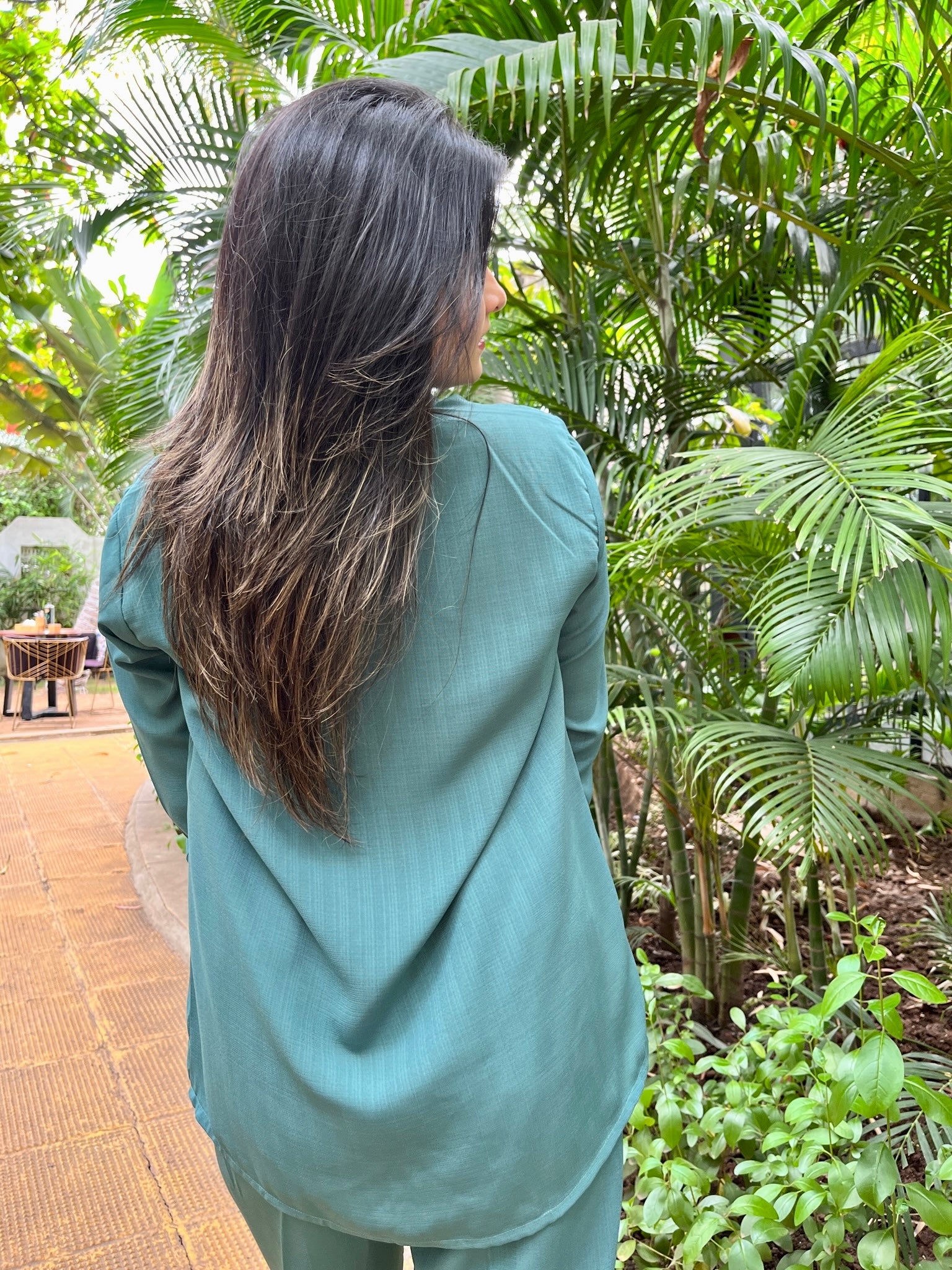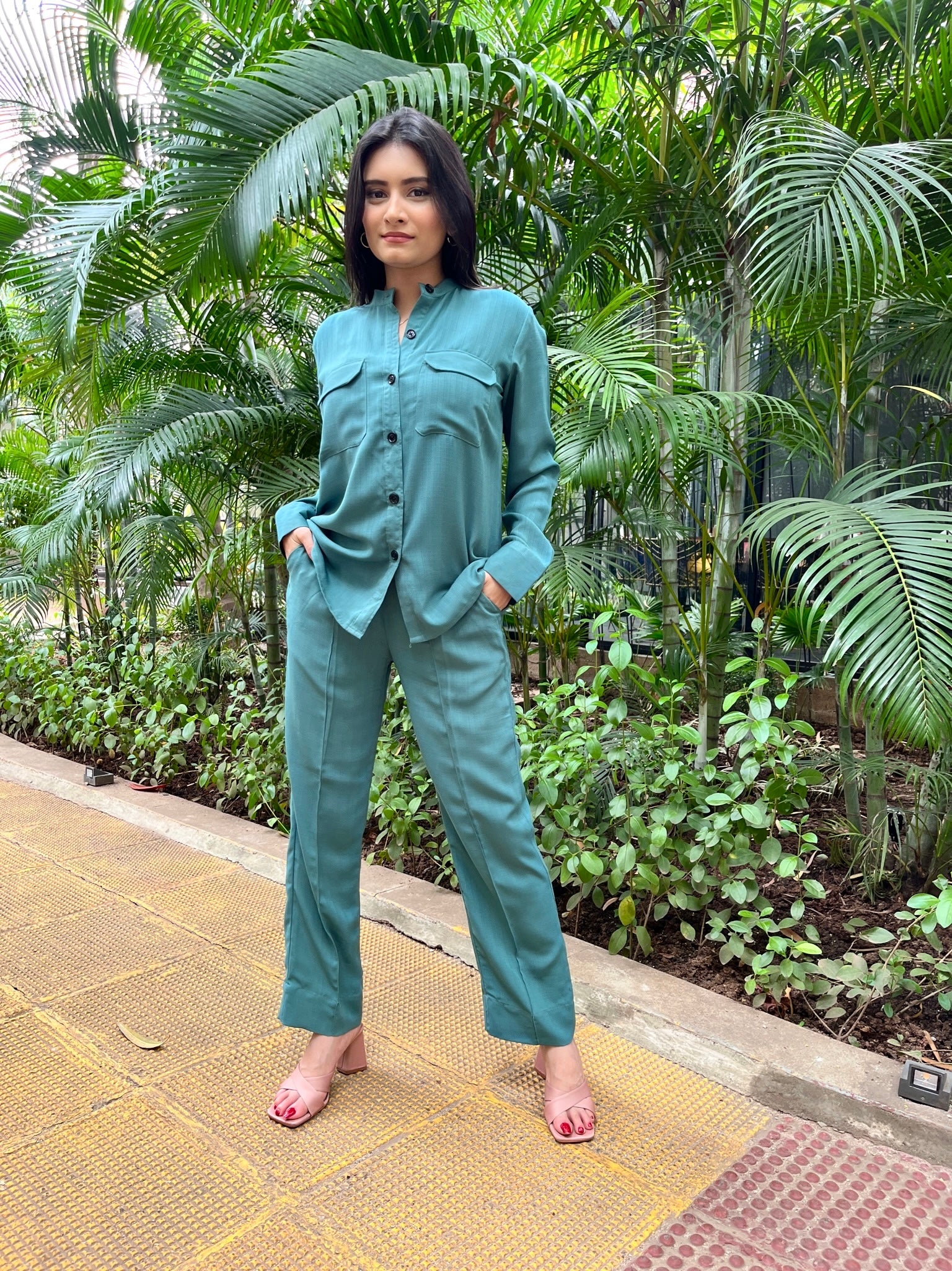 This is a classic shirt with mandarin collar and dual patch pockets. The roomy shirt makes it easy to be worn in any season. Pair it up with your favorite trousers or with our matching front stitched pants.