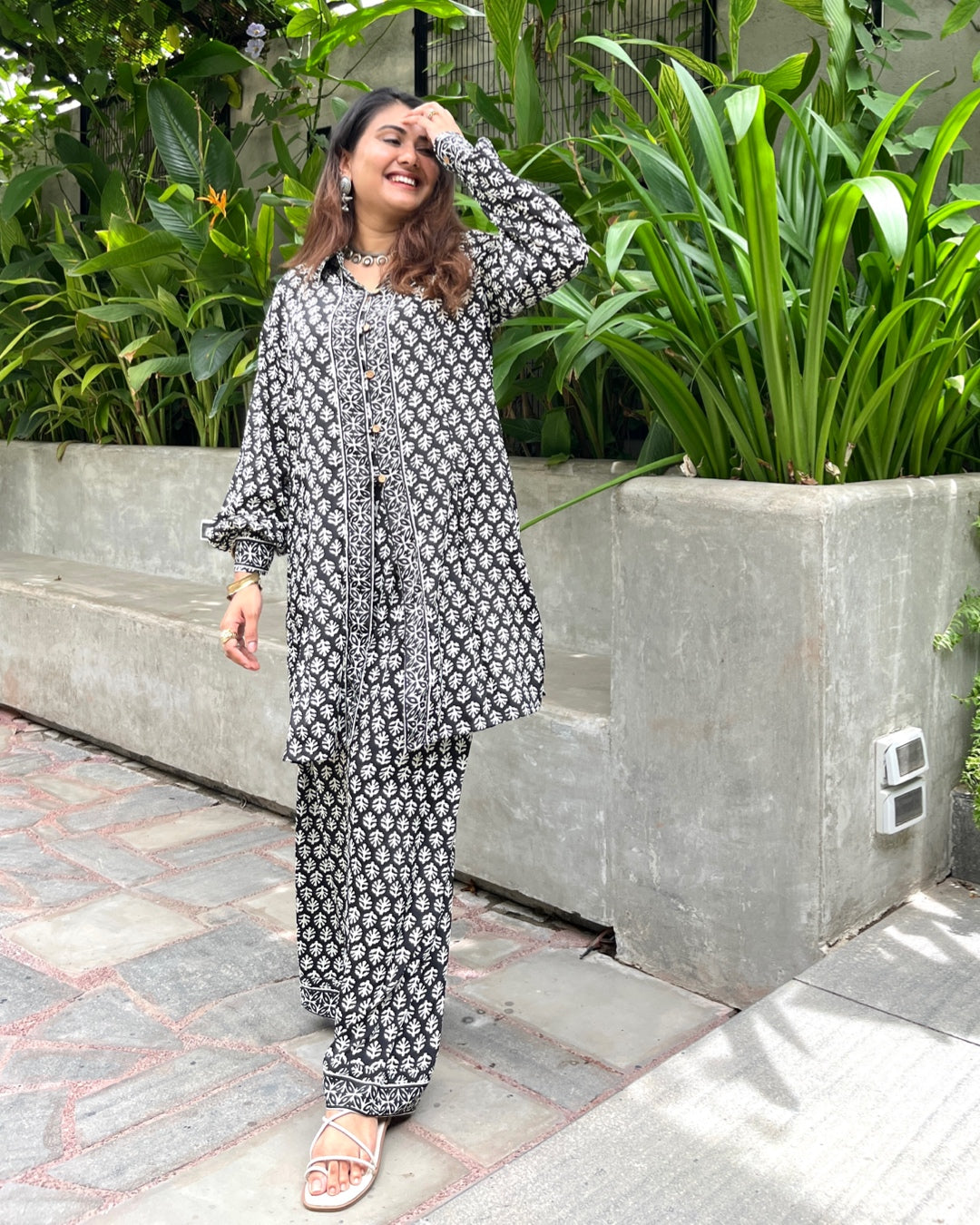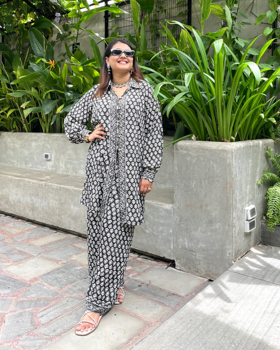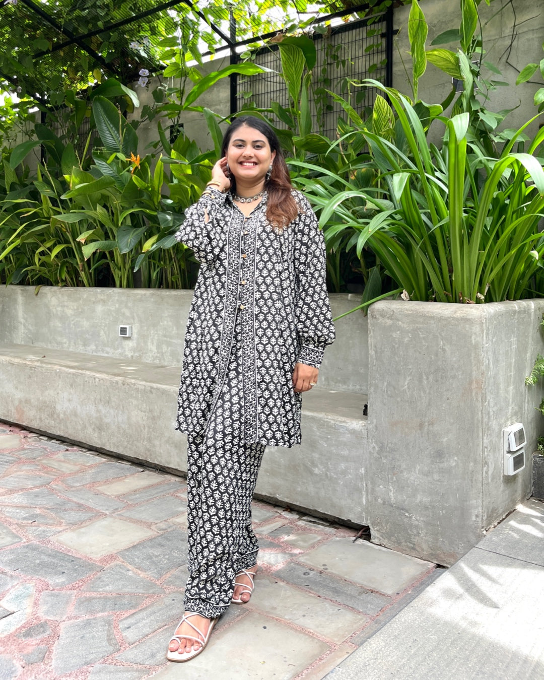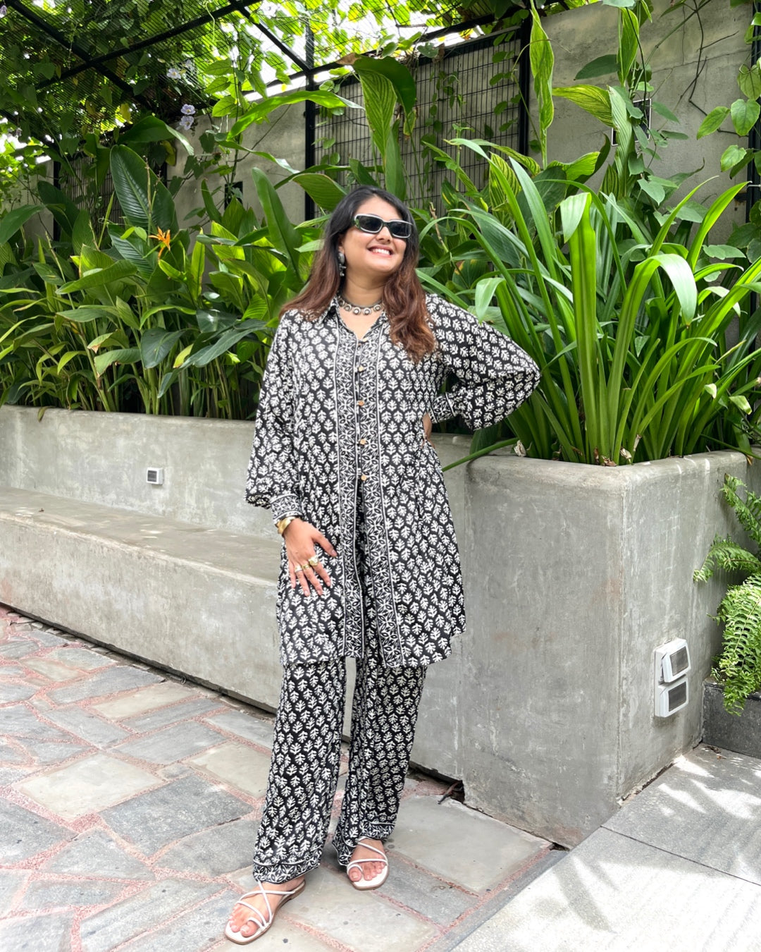 Effortlessly blend tradition and trend with the Indie Print Coord Set, a modern take on classic style. The set features a kurta, loose-fitted top with a smart collar, paired with comfortable straight-cut bottoms for a clean silhouette. Designed in striking black with intricate indie prints, it offers both comfort and understated elegance. Whether you're heading out or relaxing in style, this set delivers effortless versatility.